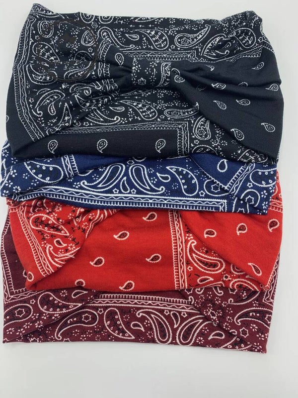 - Deze haarband is superbreed, uitgevoerd in zacht elastisch tricot, in bandanamotief. In de kleur beige.