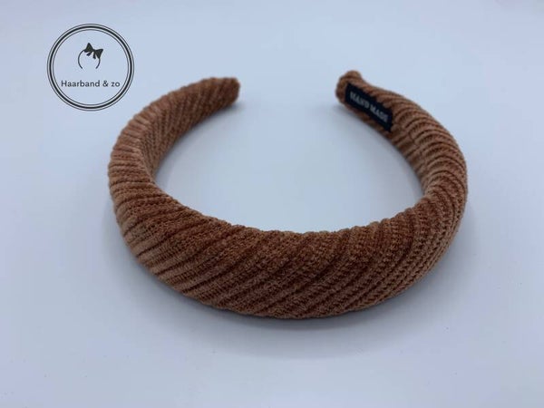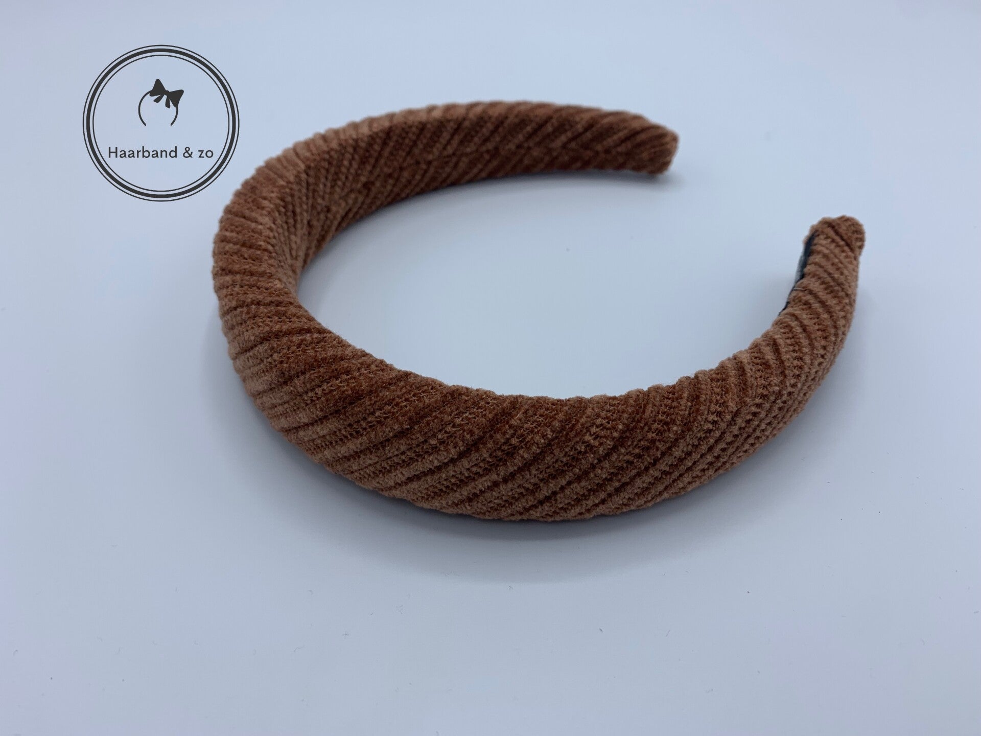 - Heerlijk zachte haarband van rondom geribbeld fluweel, met een gewatteerd laagje voor wat hoogte. In de kleur roestbruin.