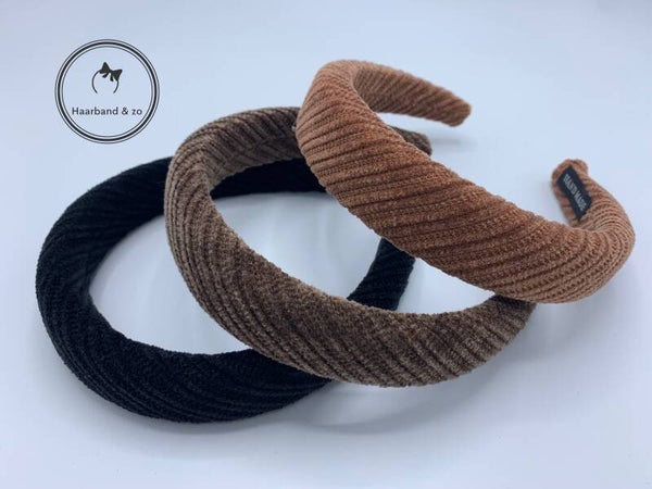 - Heerlijk zachte haarband van rondom geribbeld fluweel, met een gewatteerd laagje voor wat hoogte. In de kleur zwart.