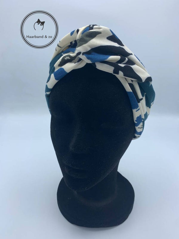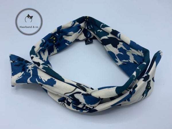 - Haarband met ijzerdraad in bloemenprint met crèmekleurige ondergrond en blauwe (petrol kleur) bloemen, van ons eigen merk.