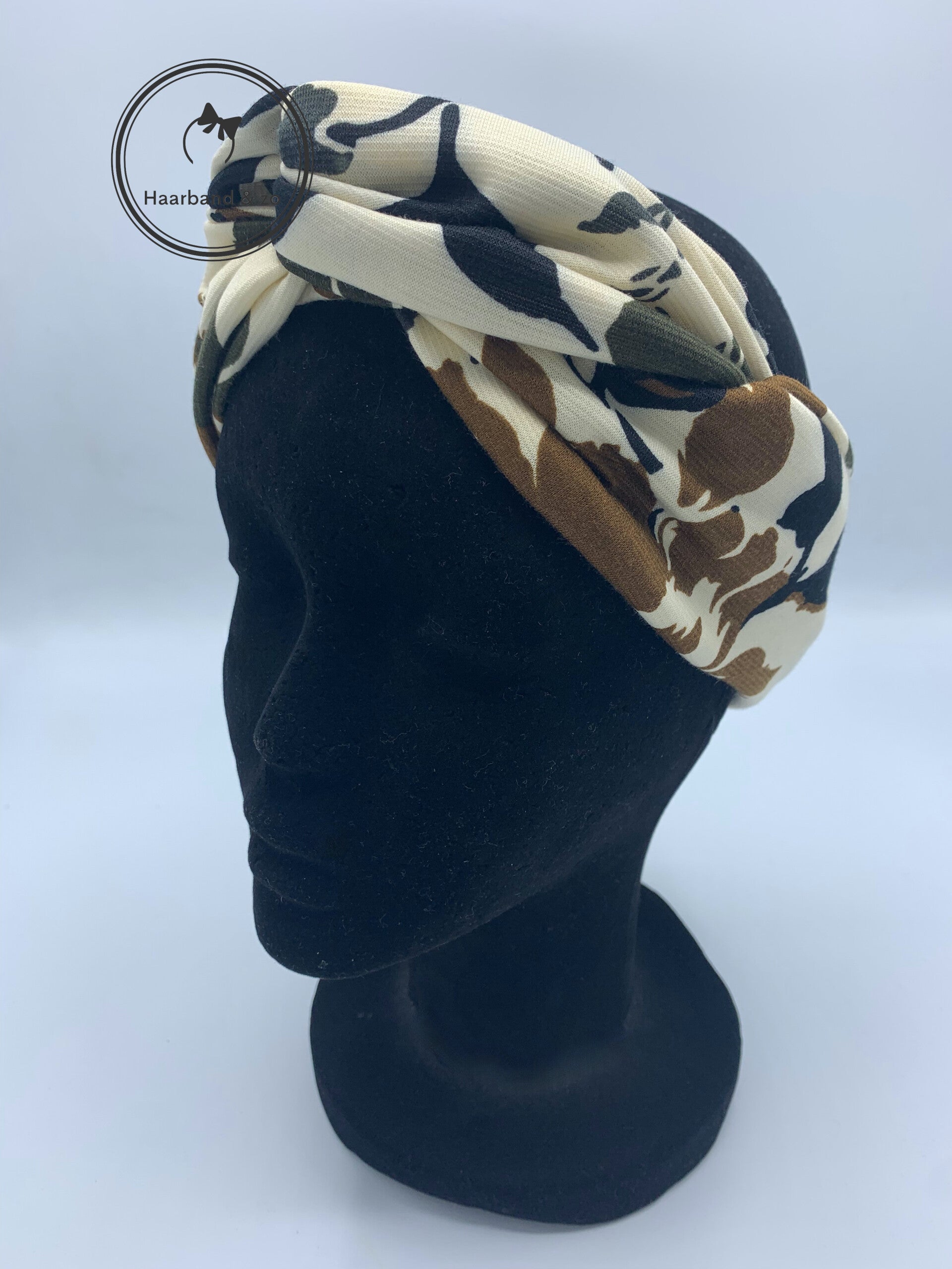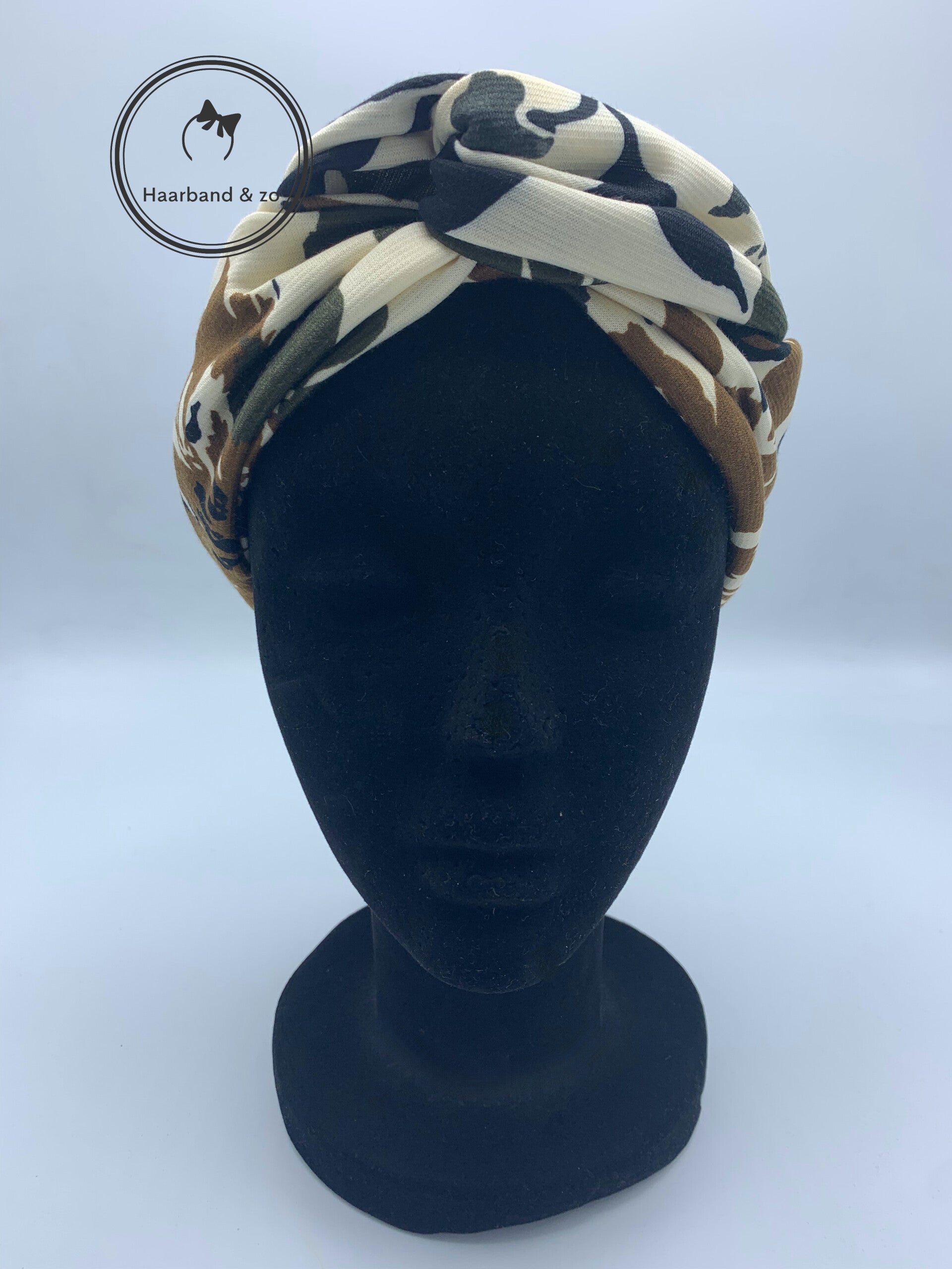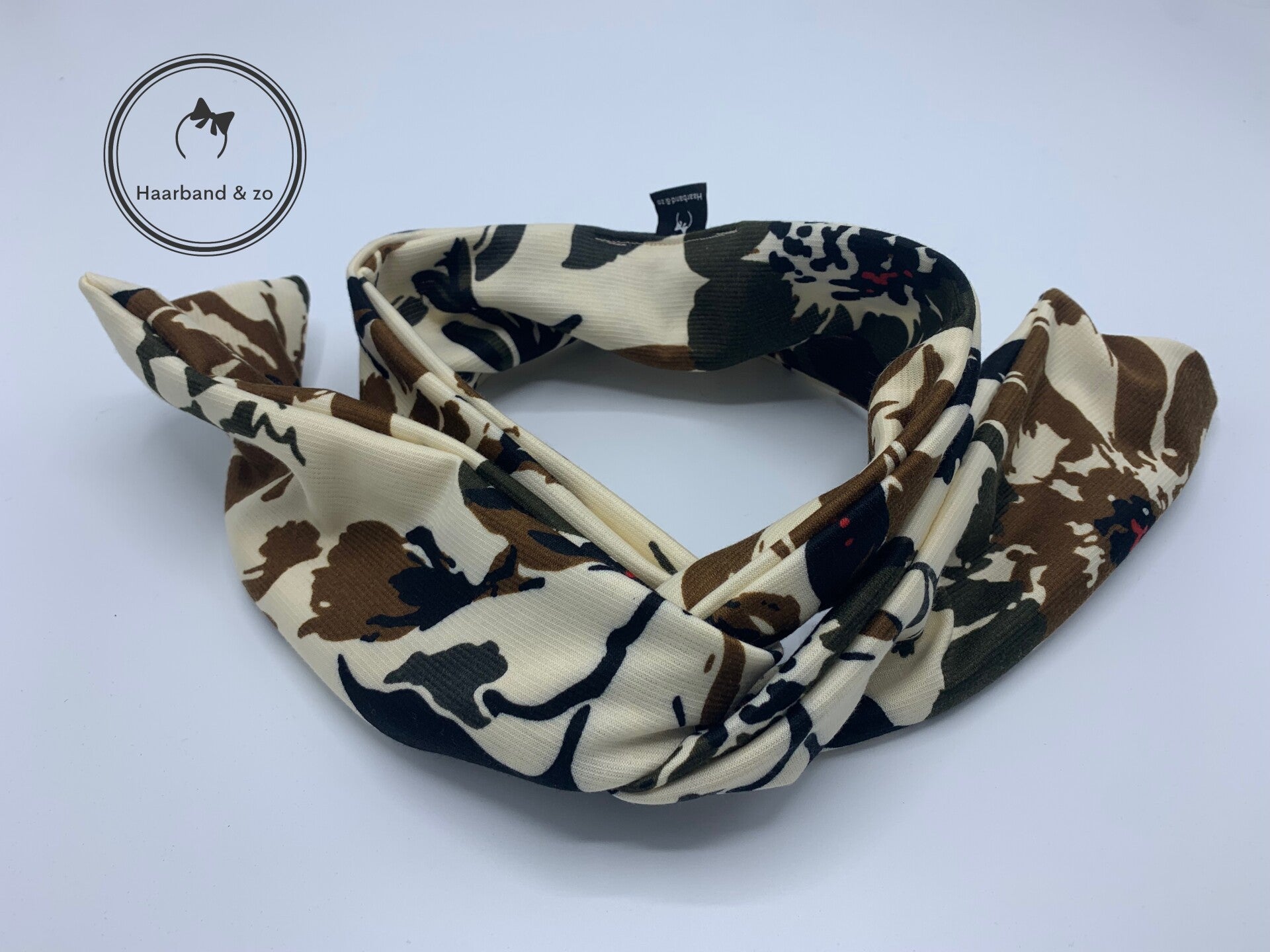 - Haarband met ijzerdraad in bloemenprint met beige ondergrond beige/bruin/groen, van ons eigen merk.