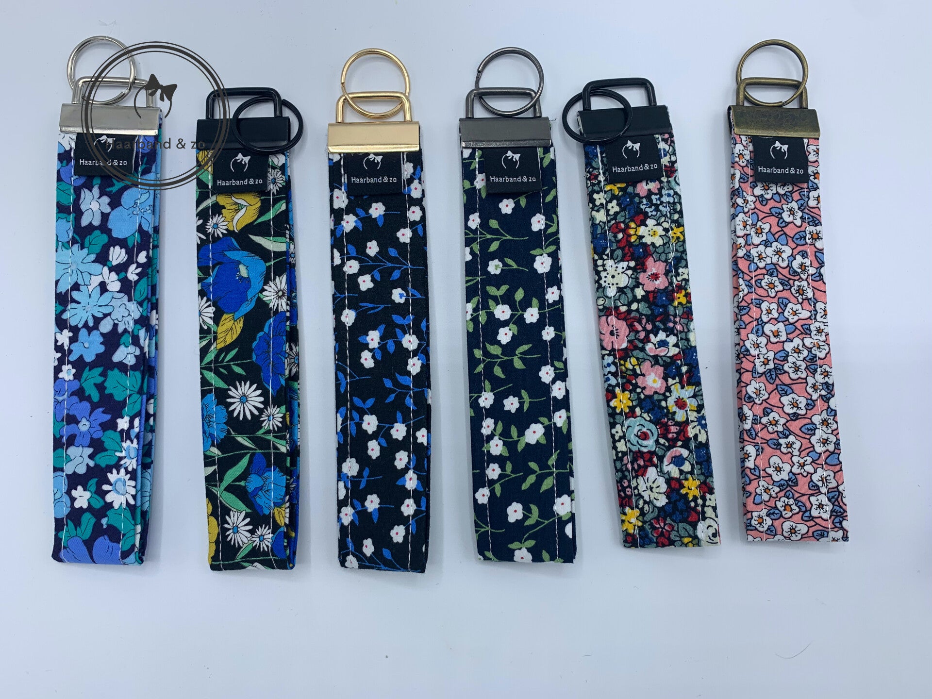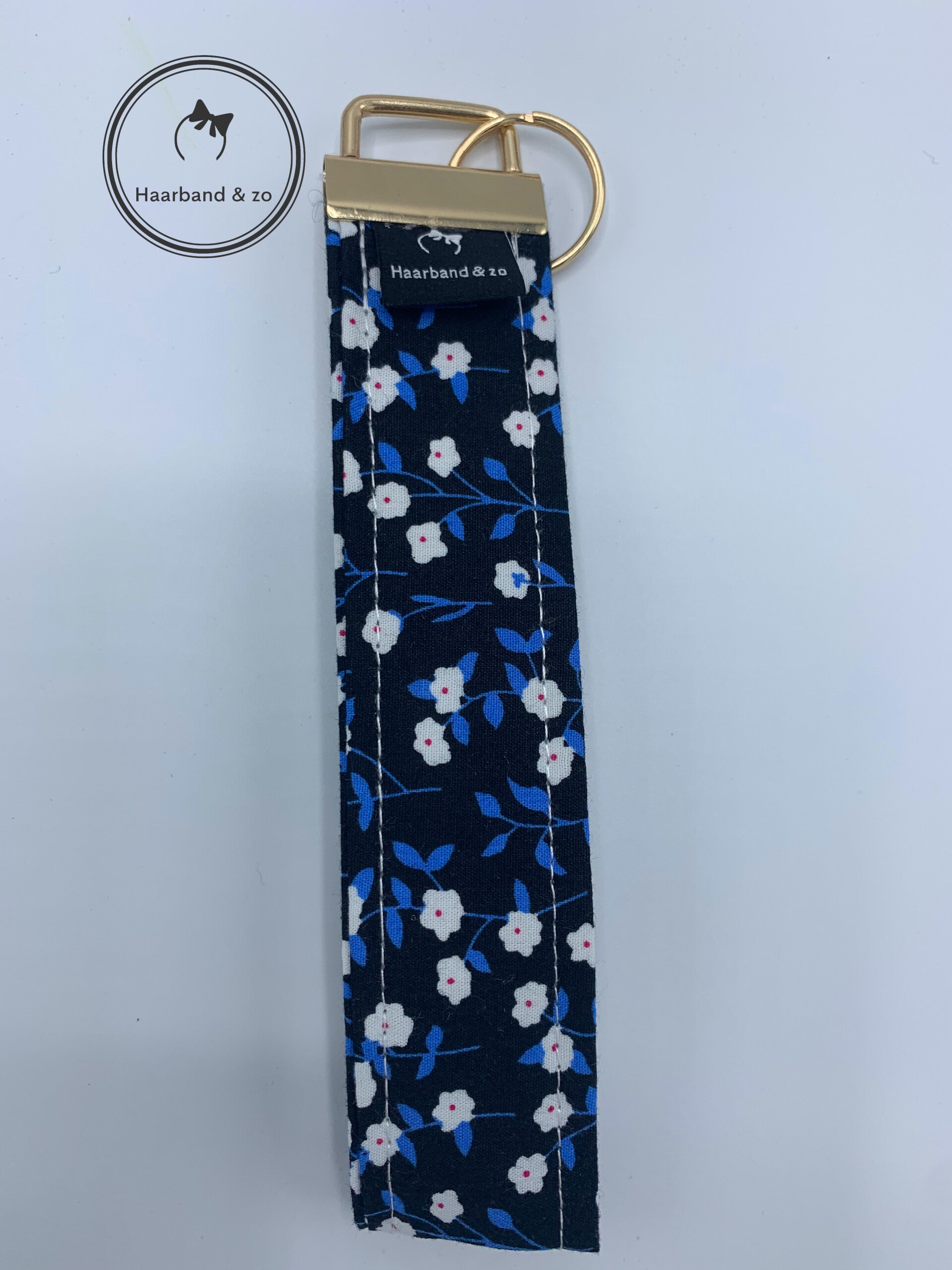 - Super handig deze sleutelhanger/wristlet (polsband), in een zwart met blauwe bloemenprint. Gemaakt van 100% katoen. Van ons eigen merk.
