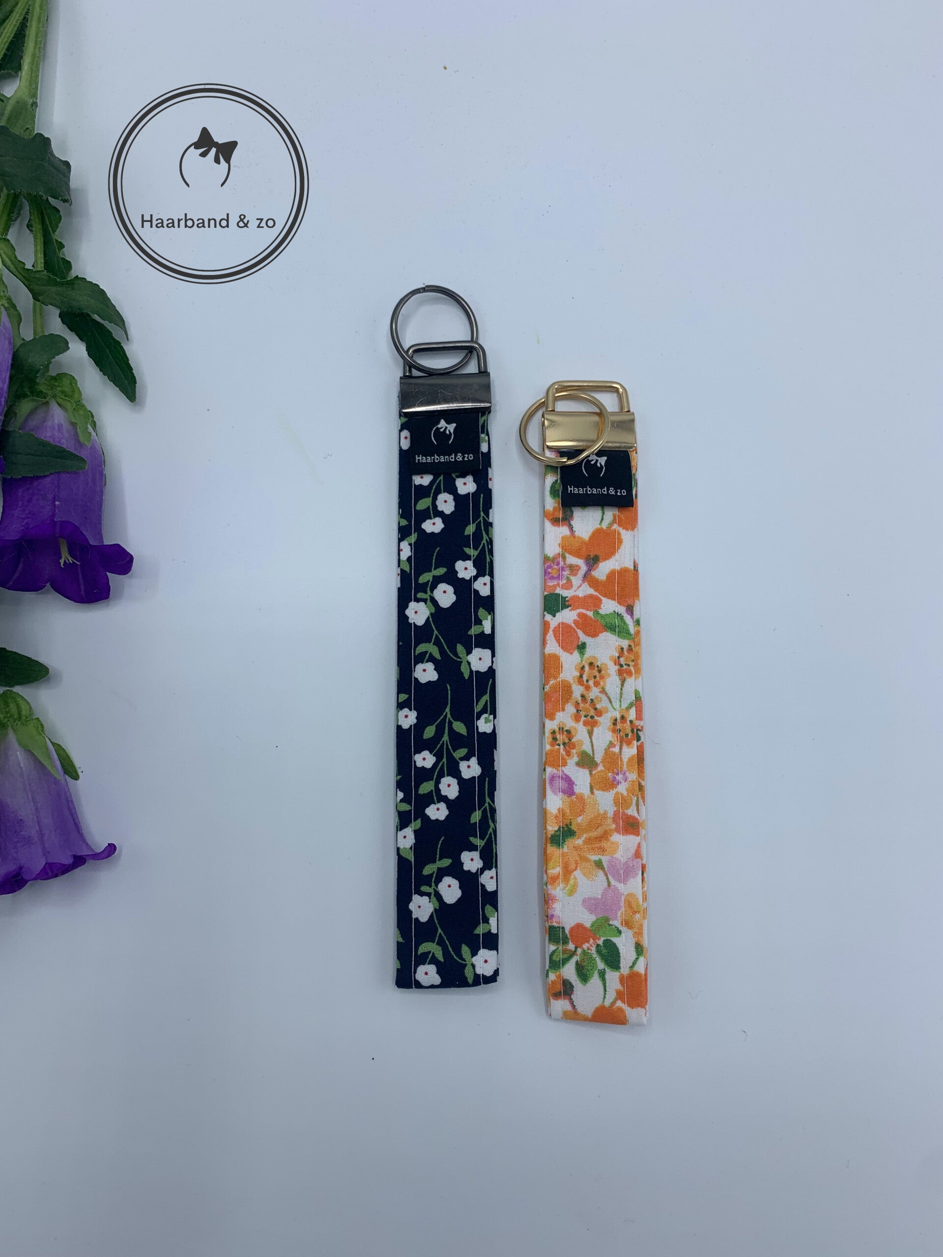 - Super handig deze sleutelhanger/wristlet (polsband), in een donkerblauwe bloemenprint. Gemaakt van 100% katoen. Van ons eigen merk.