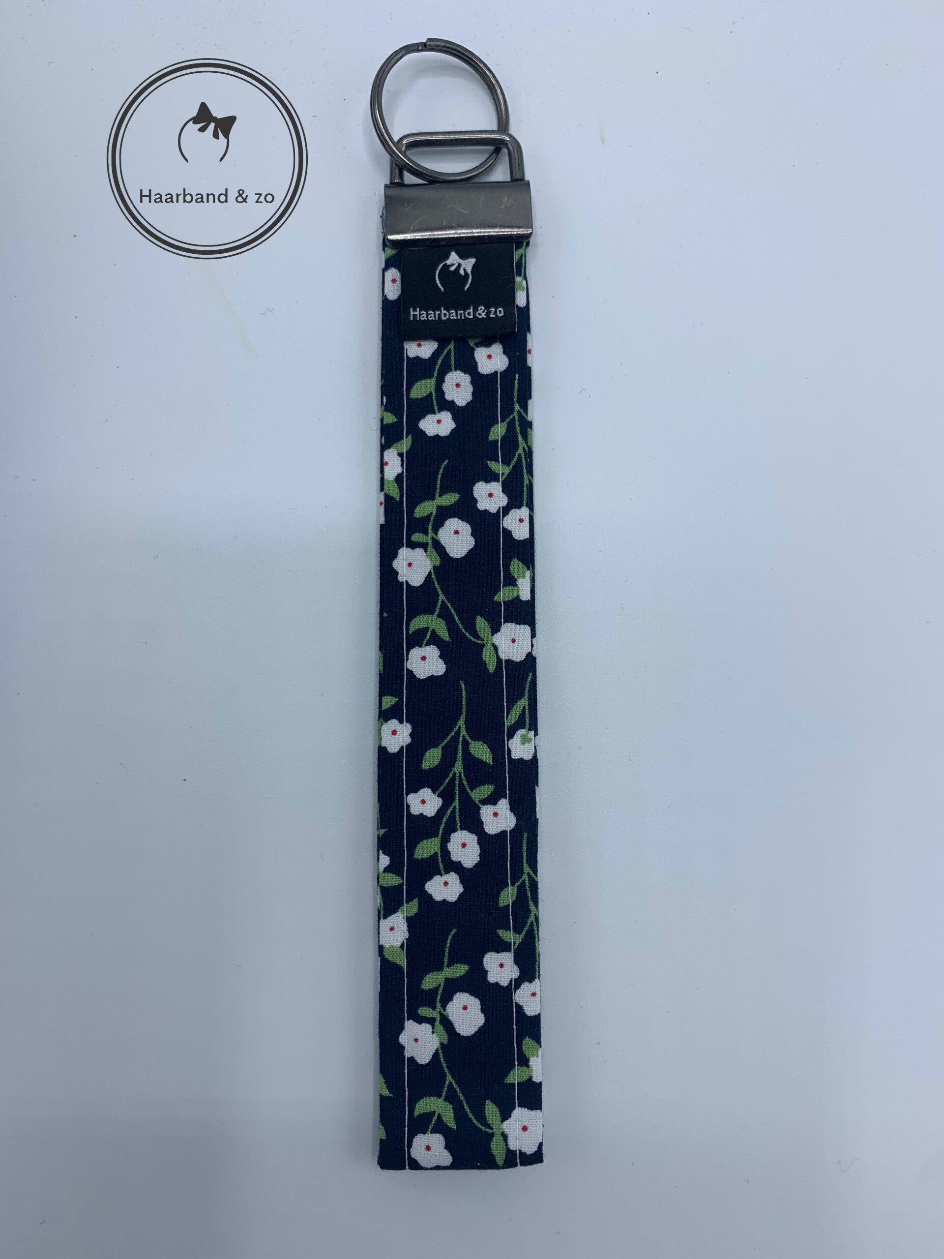 Haarband & zo, Sleutelhanger/Wristlet (polsband) smal, donkerblauwe bloemenprint (SH03-02)