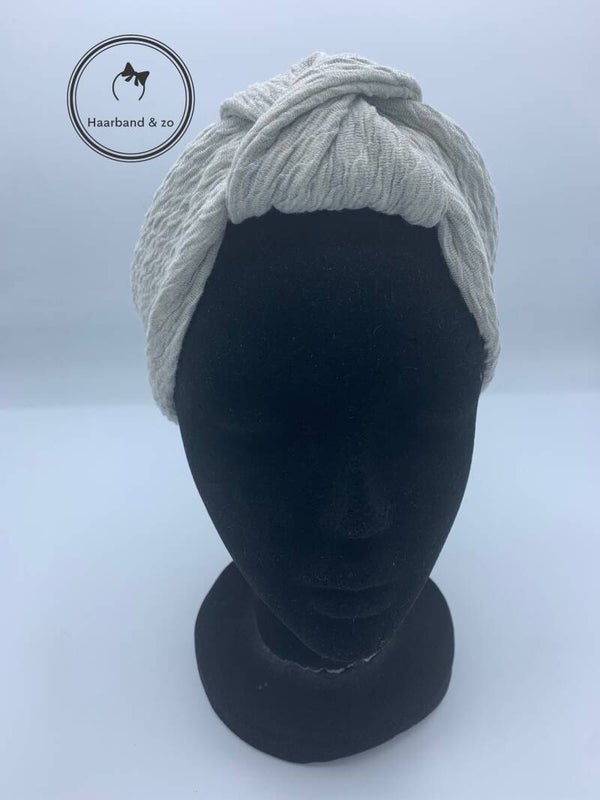 - Elastische haarband van ons eigen merk met knoop in heerlijk zacht reliëf tricot. In de kleur grijs/beige.