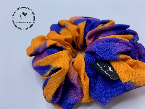 - Scrunchie in blauw/oranje in viscose (viscode kreukt wel een beetje zoals katoen), van ons eigen merk Haarband & zo.