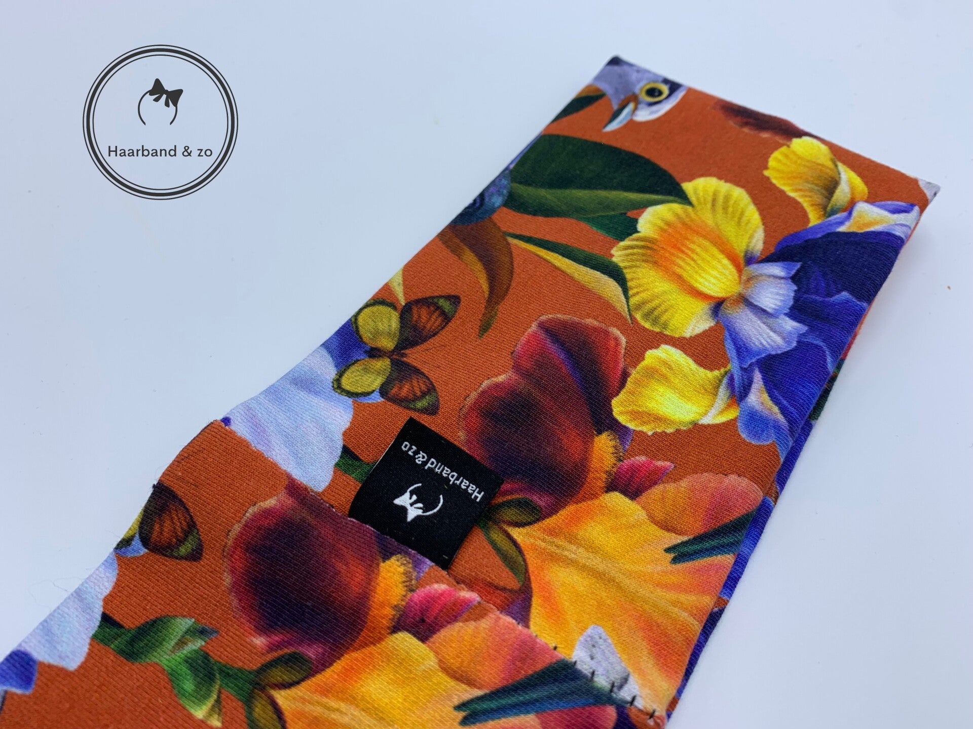 - Echt een beauty, deze elastische haarband van kwaliteits tricot in een prachtige print met bloemen, vlinders en vogels op een oranje ondergrond. Van ons eigen merk.