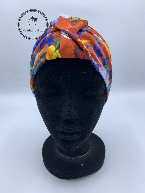 - Echt een beauty, deze elastische haarband met knoop, van kwaliteits tricot in een prachtige print met bloemen, vlinders en vogels op een oranje ondergrond. Van ons eigen merk (zonder label).