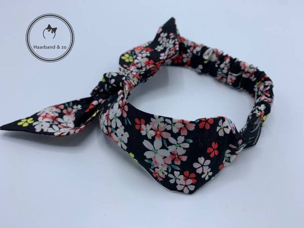 - Haarband van katoen in een bloemenprint met zwarte ondergrond. Elastische band achter, de haarband kan bovenop worden geknoopt. Van ons eigen merk.