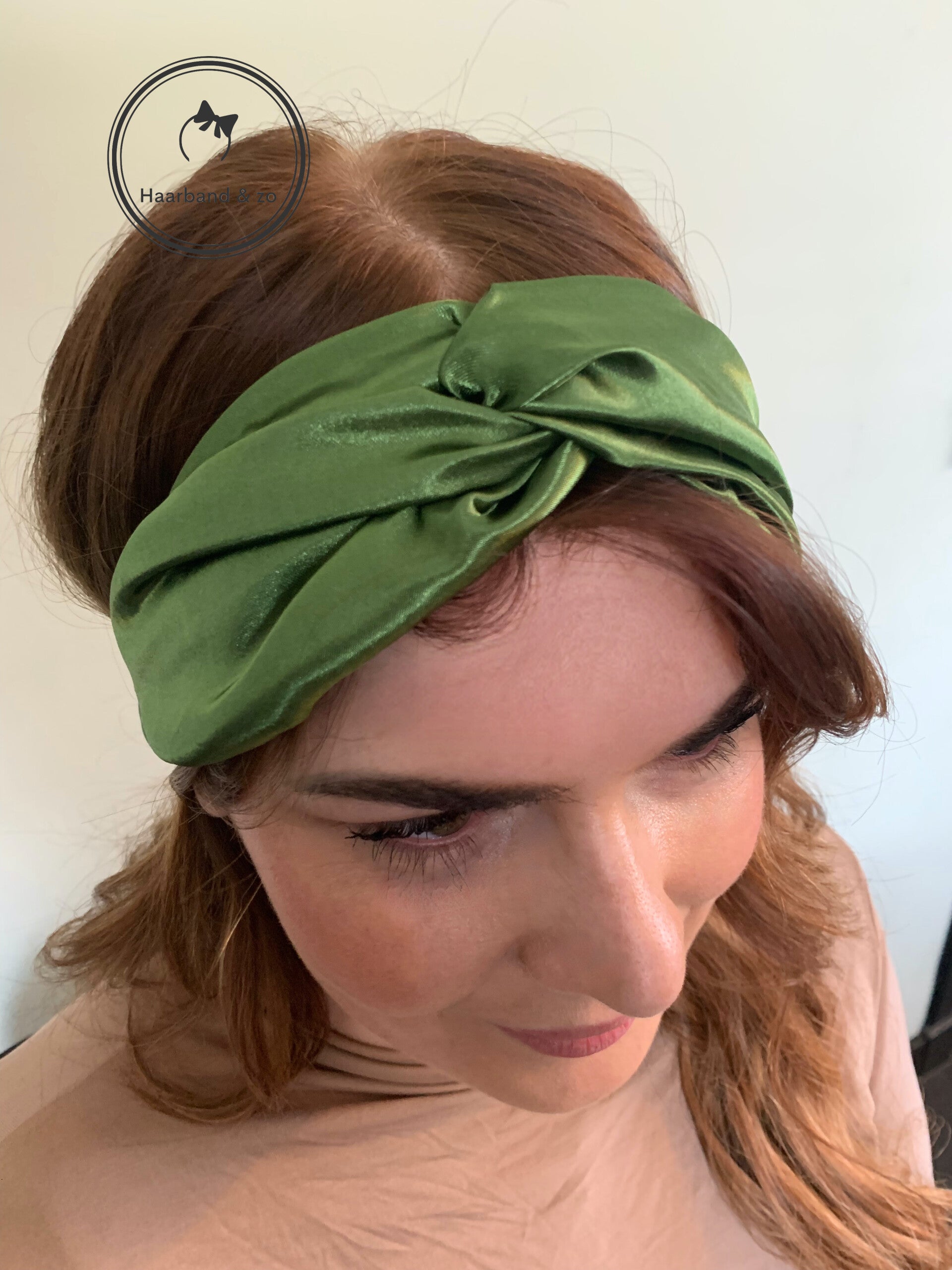 - Elastische haarband van ons eigen merk in glanzend satijn, in een prachtige kleur groen. De haarband heeft een twist en elastische band.