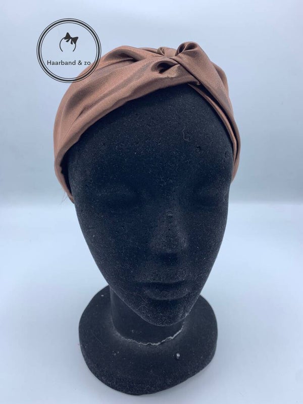 - Elastische haarband van ons eigen merk in glanzend satijn, in de kleur bruin. De haarband heeft een twist en elastische band.