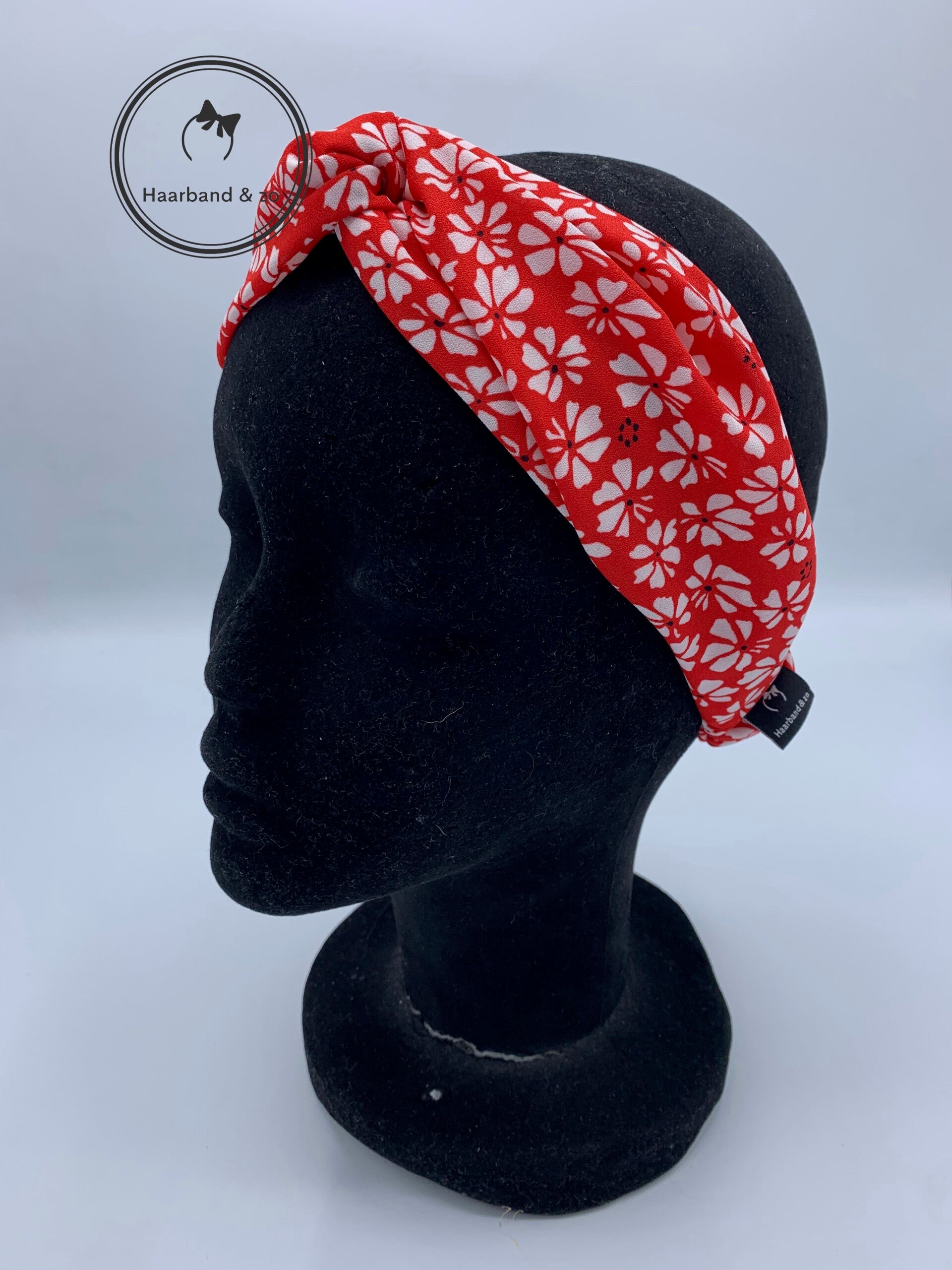 - Elastische haarband van ons eigen merk in chiffon met bloemenprint rood met wit. De haarband heeft een twist en elastische band.