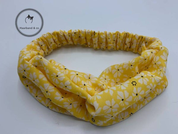 - Elastische haarband van ons eigen merk in chiffon met bloemenprint geel met wit. De haarband heeft een twist en elastische band.