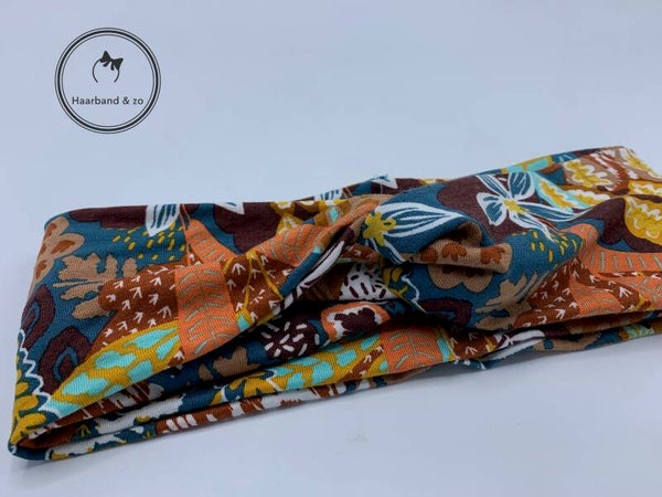 - Extra brede dubbele elastische haarband met twist van heerlijk zacht en rekbaar tricot, in bruin/geel/groene bladeren print, van ons eigen merk (zonder label)