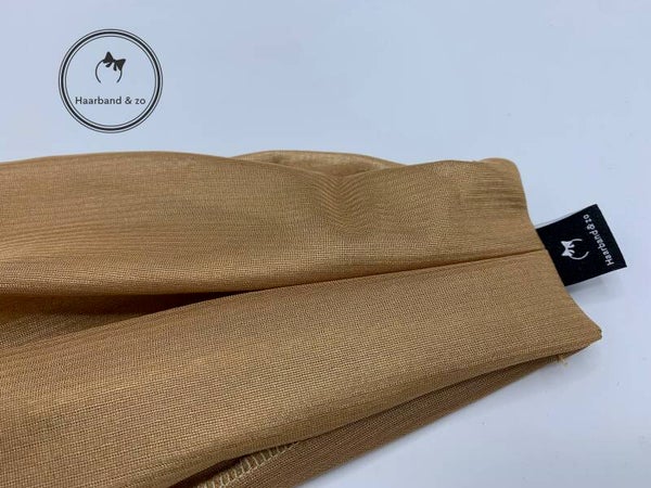 - Mooie soepele elastische haarband, van fijne iets glanzende gestreepte stof, semitransparant in de kleur karamel. Van ons eigen merk.