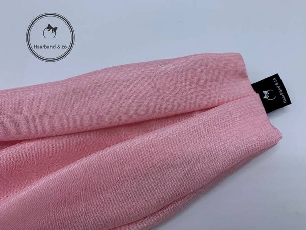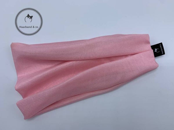 - Mooie soepele elastische haarband, van fijne iets glanzende gestreepte stof, semitransparant in de kleur roze. Van ons eigen merk.