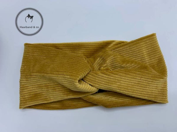 - Elastische haarband in heerlijk zacht en soepelribfluweel in een okergele kleur, van ons eigen merk.