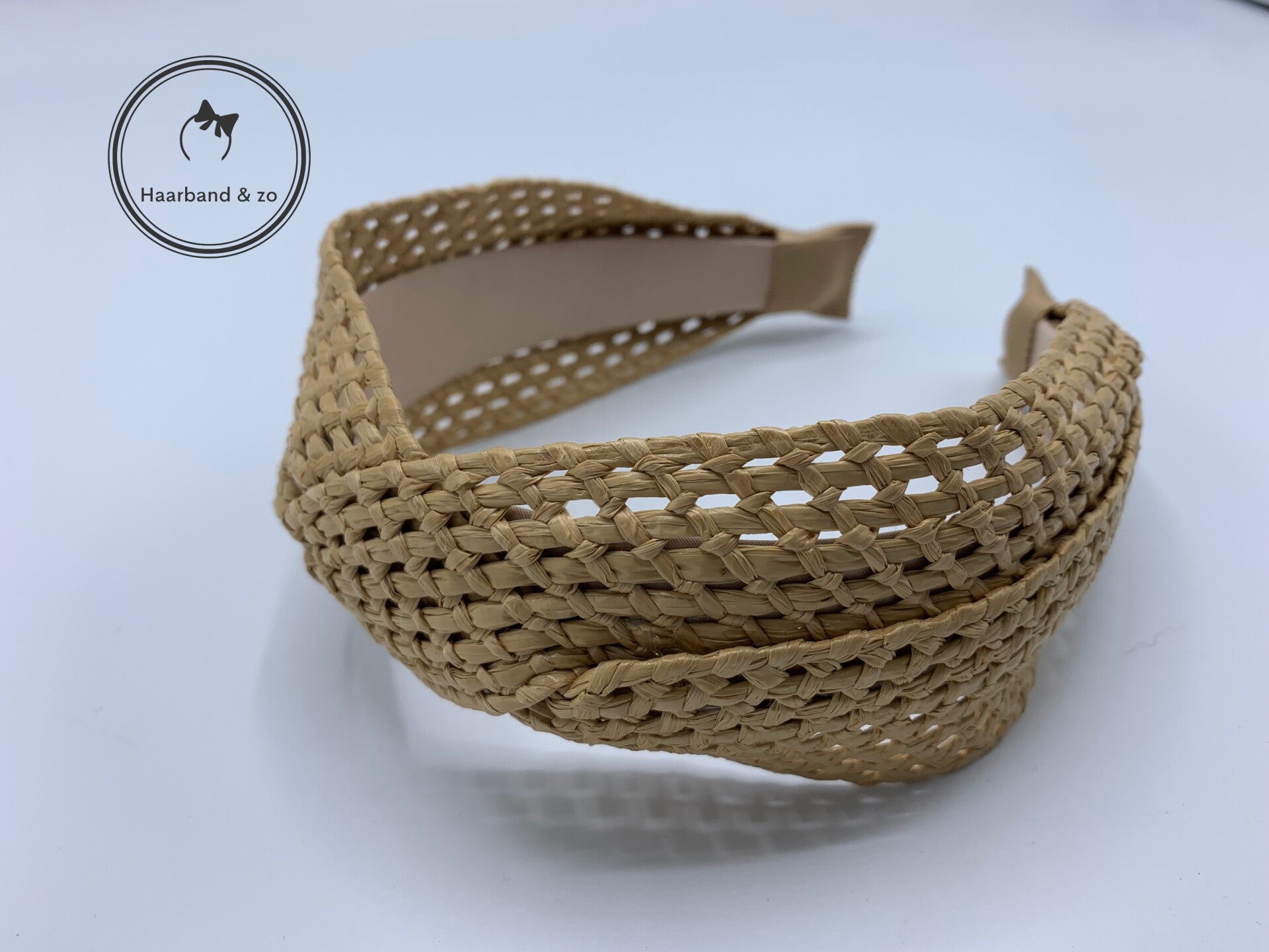 - Brede booghaarband met twist, van opengewerkt riet in de kleur beige.