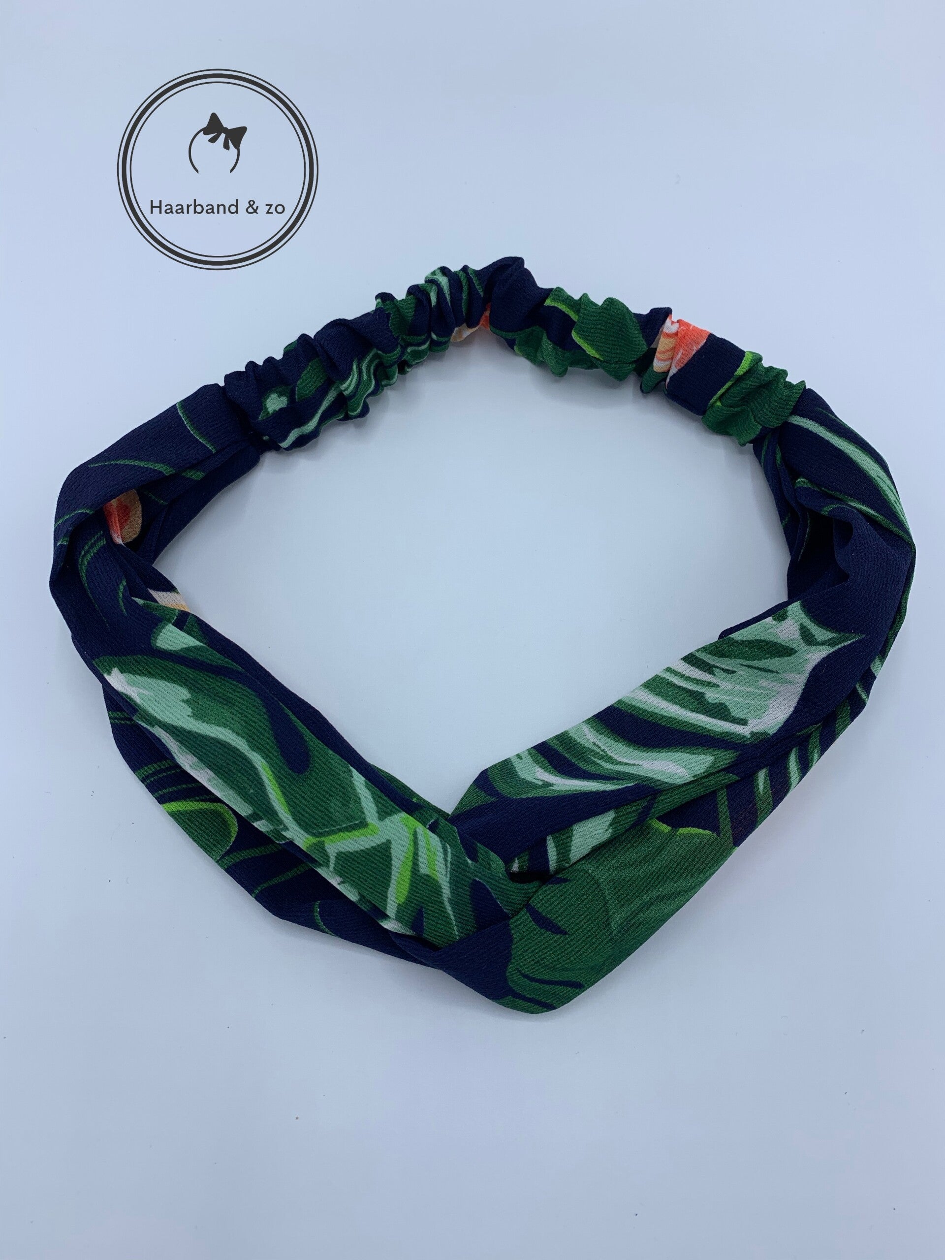 - Elastische haarband met twist middenop, uitgevoerd in chiffon met bloemenprint, hoofdkleur donkerblauw.
