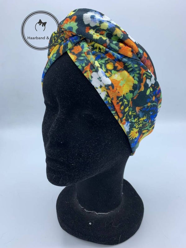 - Haarband met ijzerdraad van jersey bubble, in een zwart met geel veelkleurig bloemenpatroon, van ons eigen merk.