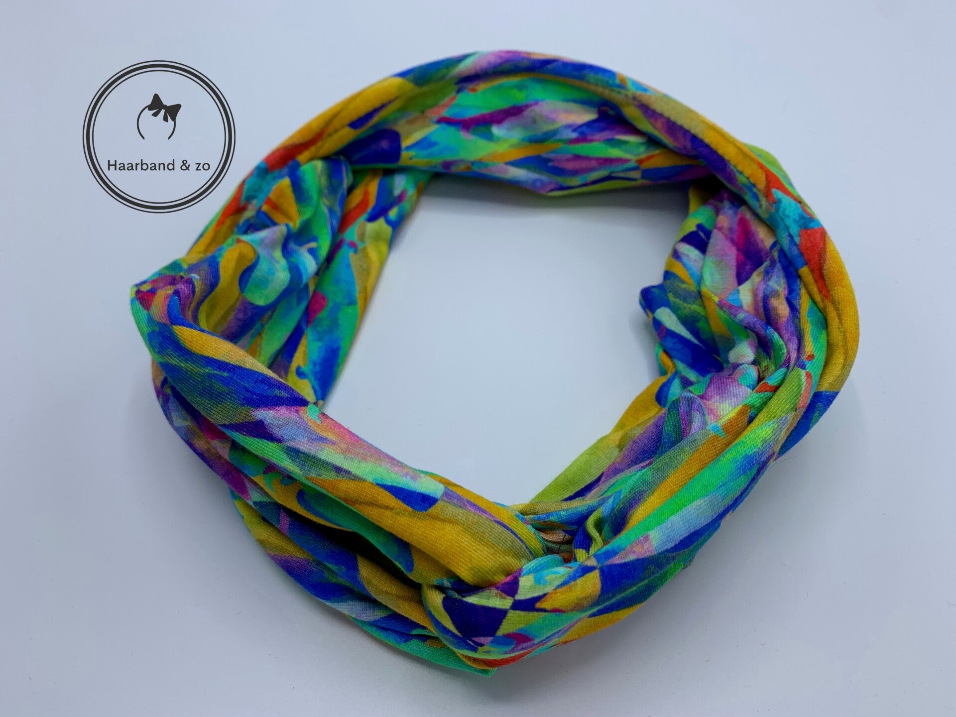 - Extra brede haarband met ijzerdraad van katoen tricot. In een prachtige veel kleurige print in geel, blauw en groen. Van ons eigen merk.