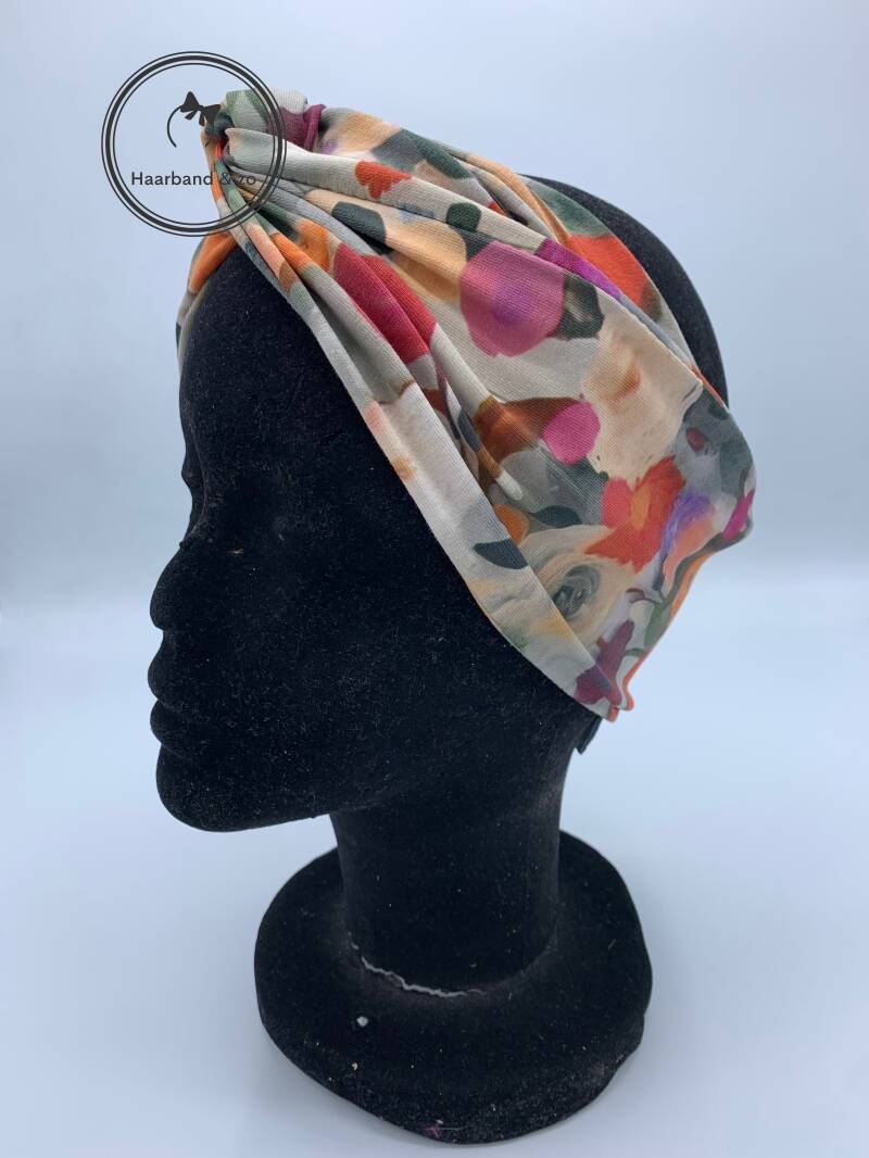 - Extra brede haarband met ijzerdraad van katoen tricot. In een prachtige veel kleurige bloemenprint in grijsgroen, roze en beige. Van ons eigen merk.