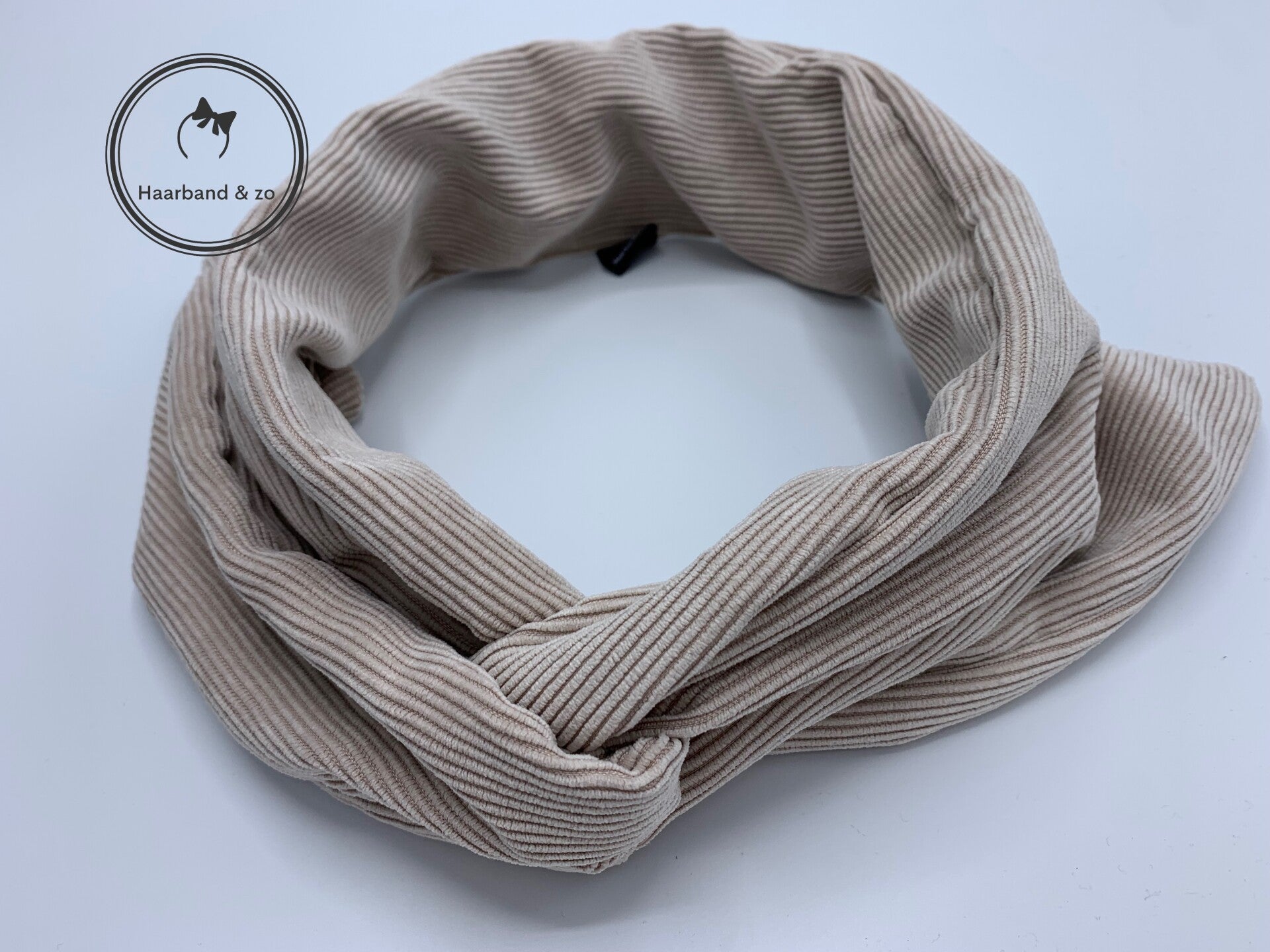 - Een heerlijke basic deze haarband van heerlijk zacht, ribfluweel, van ons eigen merk. In de kleur beige.