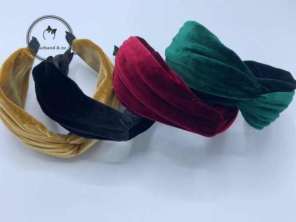 - Extra brede fluwelen (boog)haarband, in de kleur wijnrood. Deze haarband heeft geen knoop bovenop maar een twist.