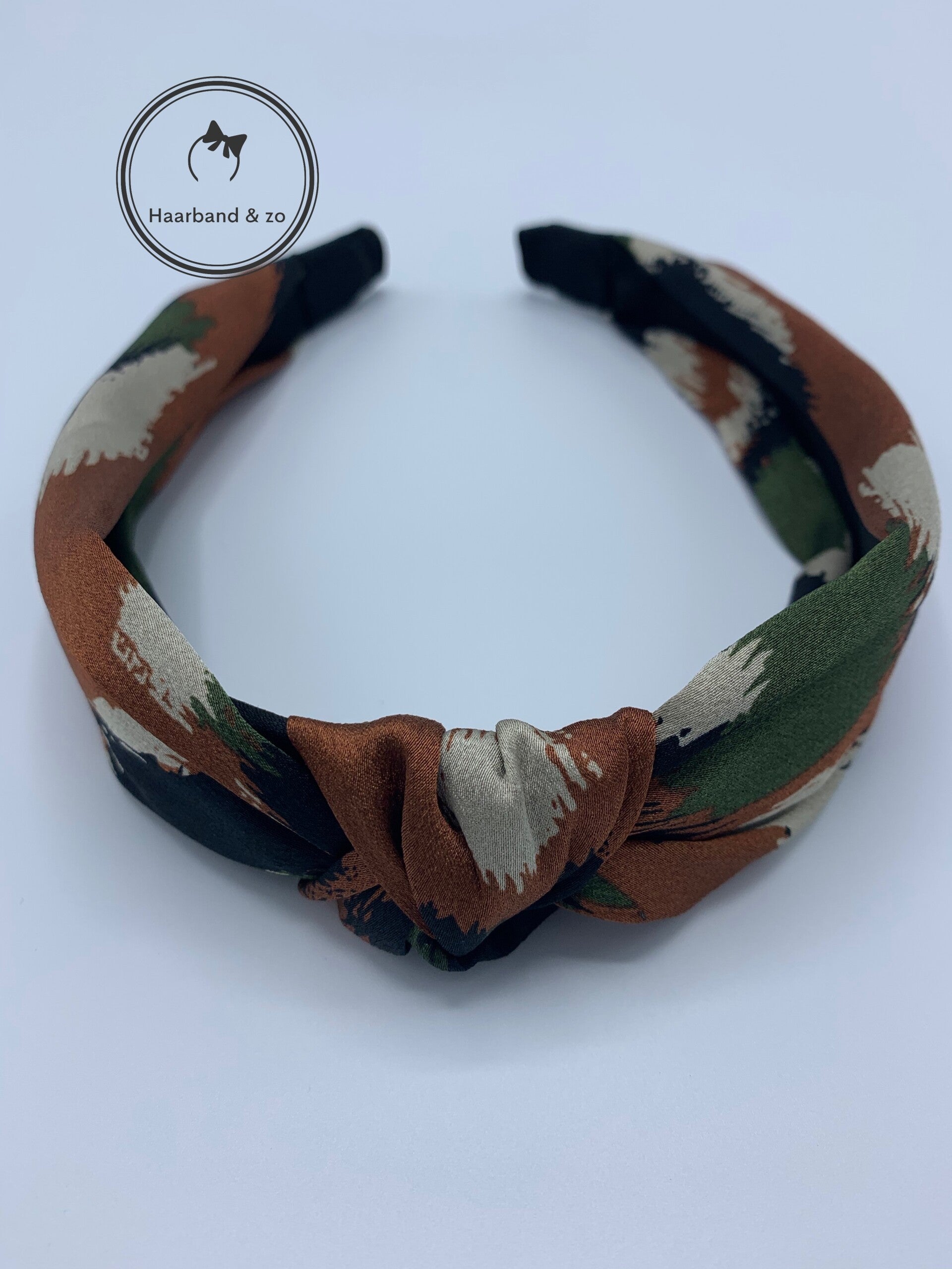Satijnen booghaarband met print, geknoopt, tijgerprint, zwart met roestbruin en groene accenten (art.nr. 13-04)