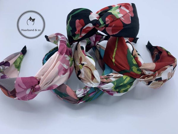 - Extra brede satijnen (boog)haarband met bloemenprint, met de kleur zwart als ondergrondkleur. Deze haarband heeft geen knoop bovenop maar een twist.
