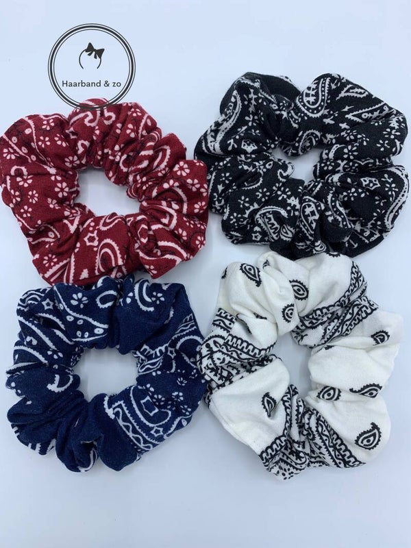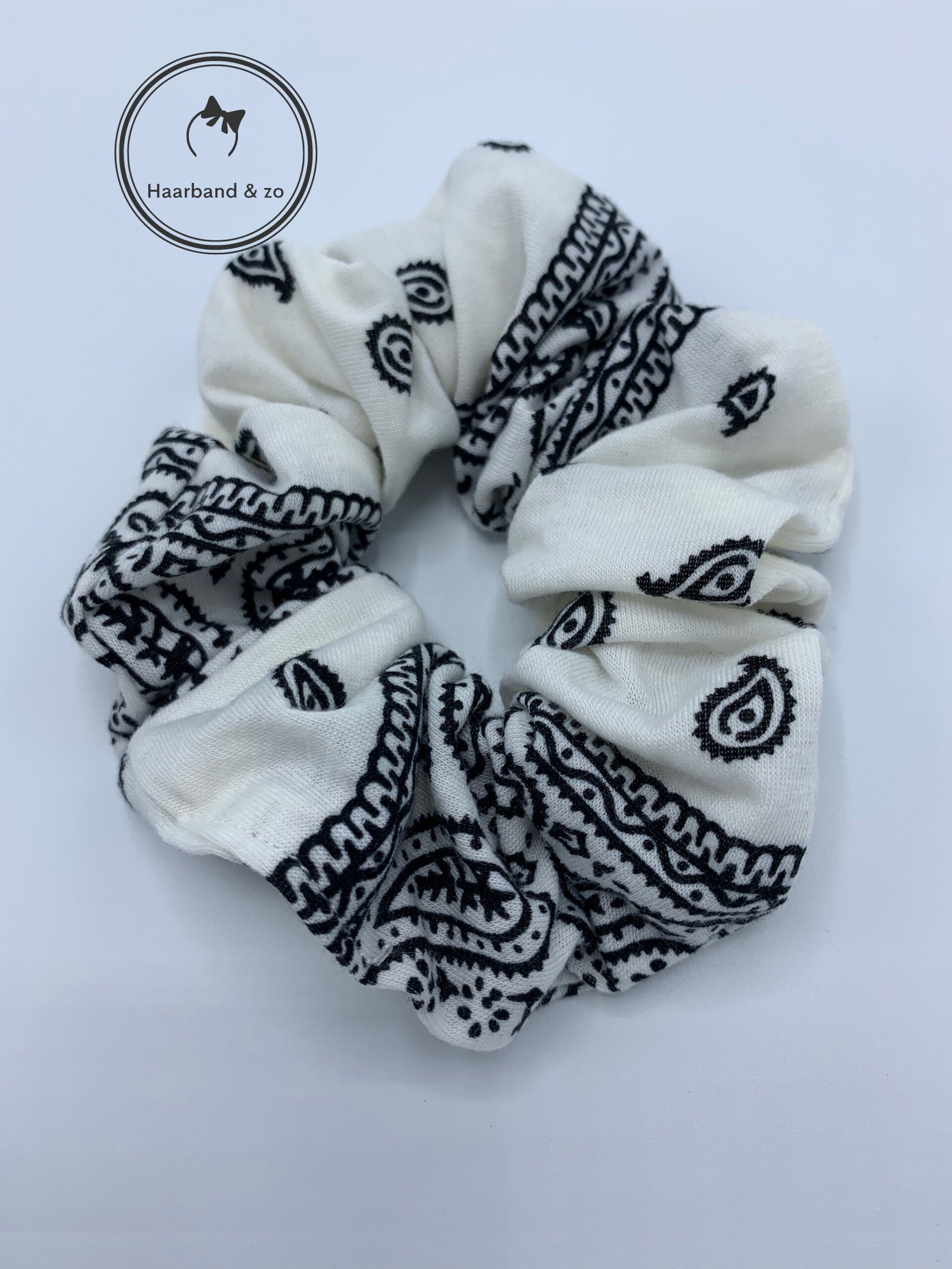 - Mooie grote scrunchie (wokkel, frutsel), met bandanapatroon in de kleur wit, gemaakt van heerlijk zacht, elastisch tricot.