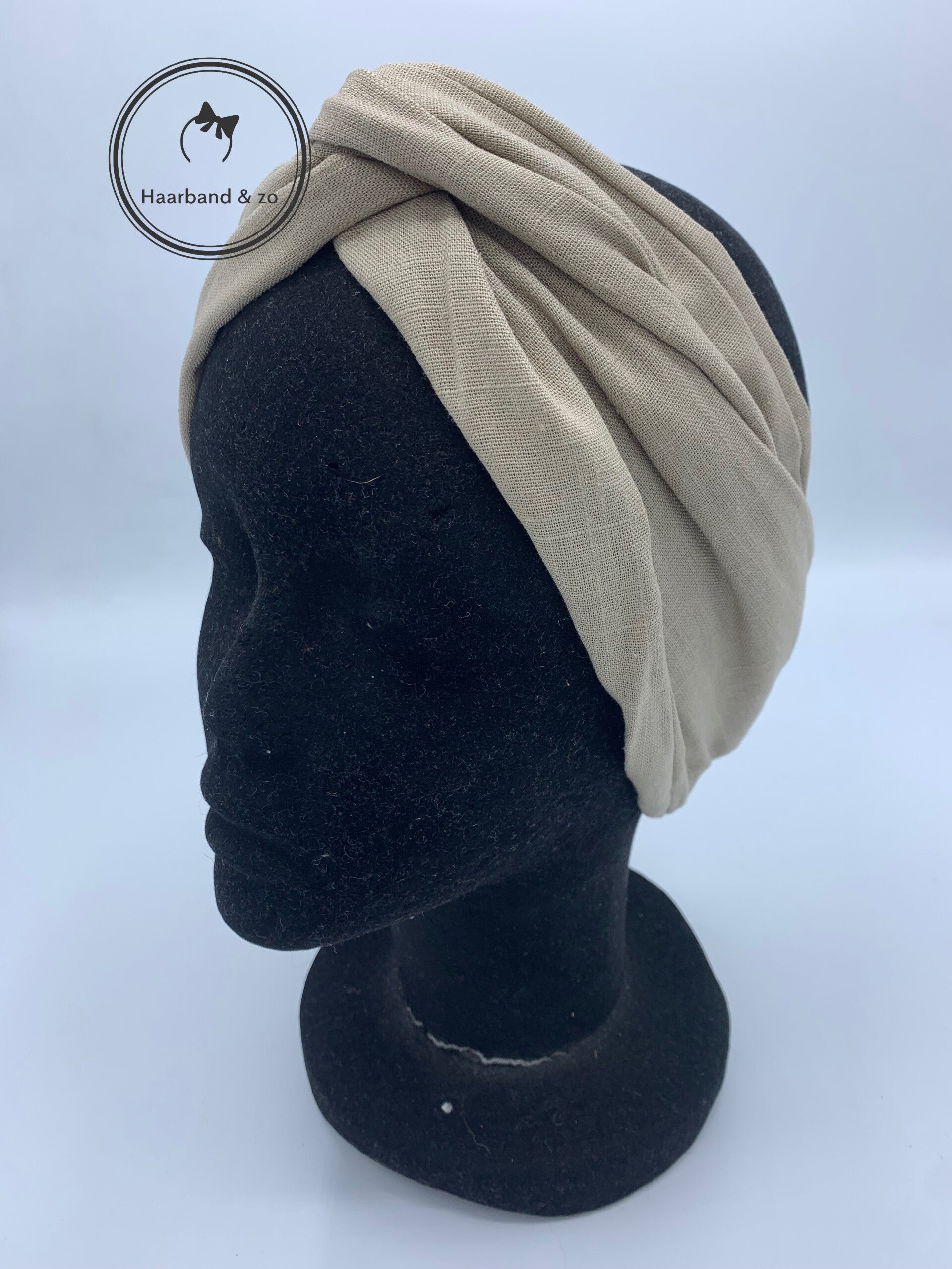 - Een prachitge brede haarband met ijzerdraad, in khaki linnen. Van ons eigen merk.
