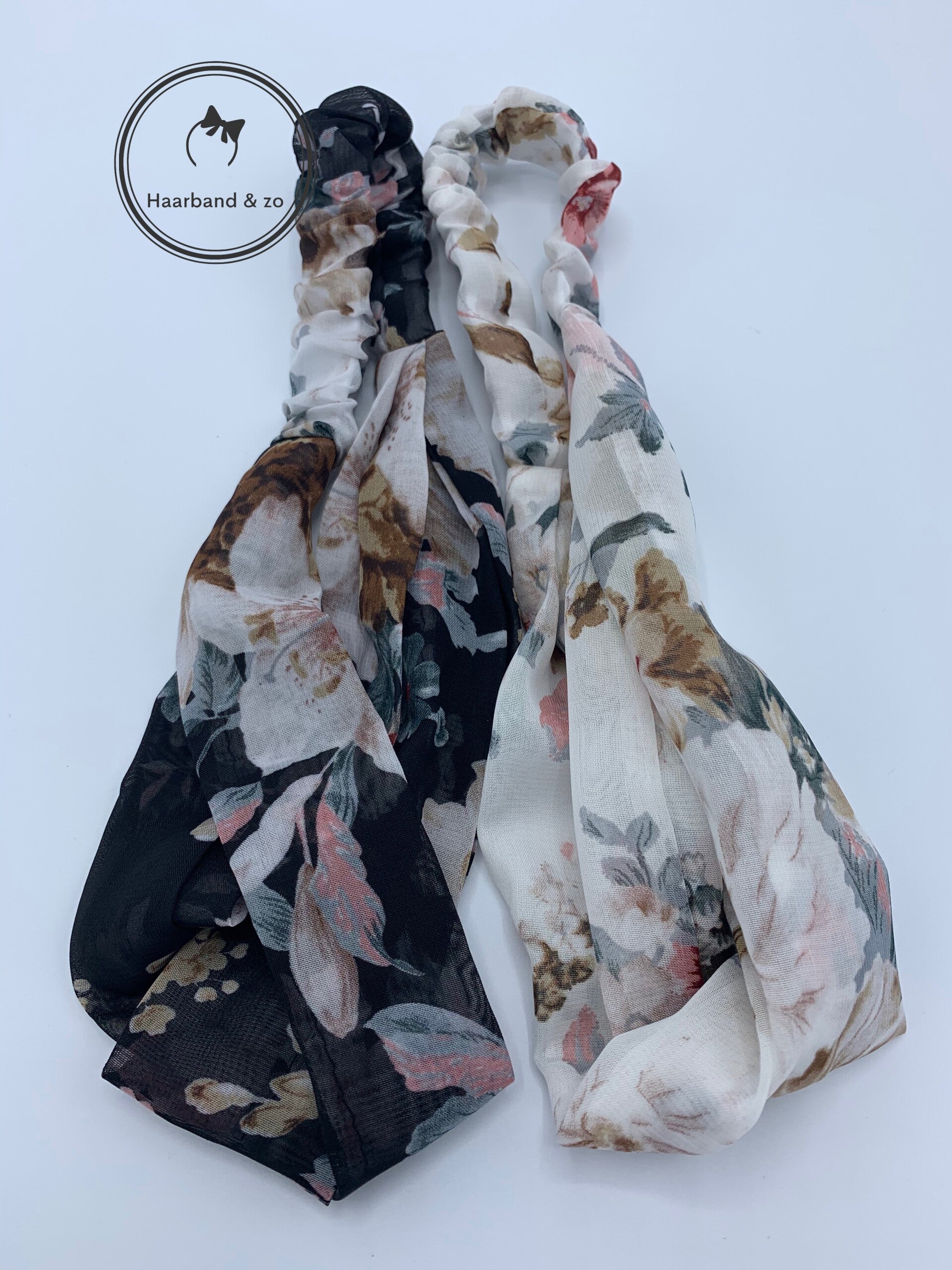 Elastische haarband van transparant chiffon, in bloemenprint hoofdkleur creme (art.nr. 157-08)