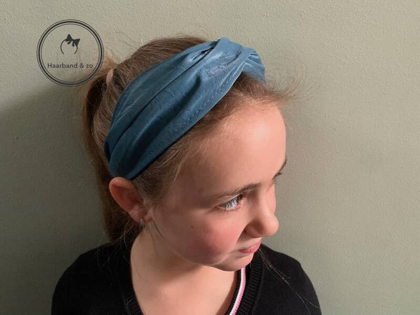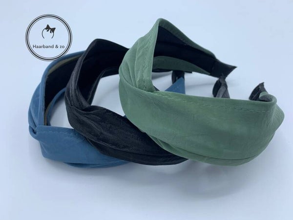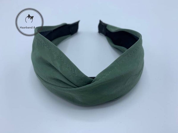 - Haarband in glanzende leatherlook met halve twist. In de kleur grijsgroen.