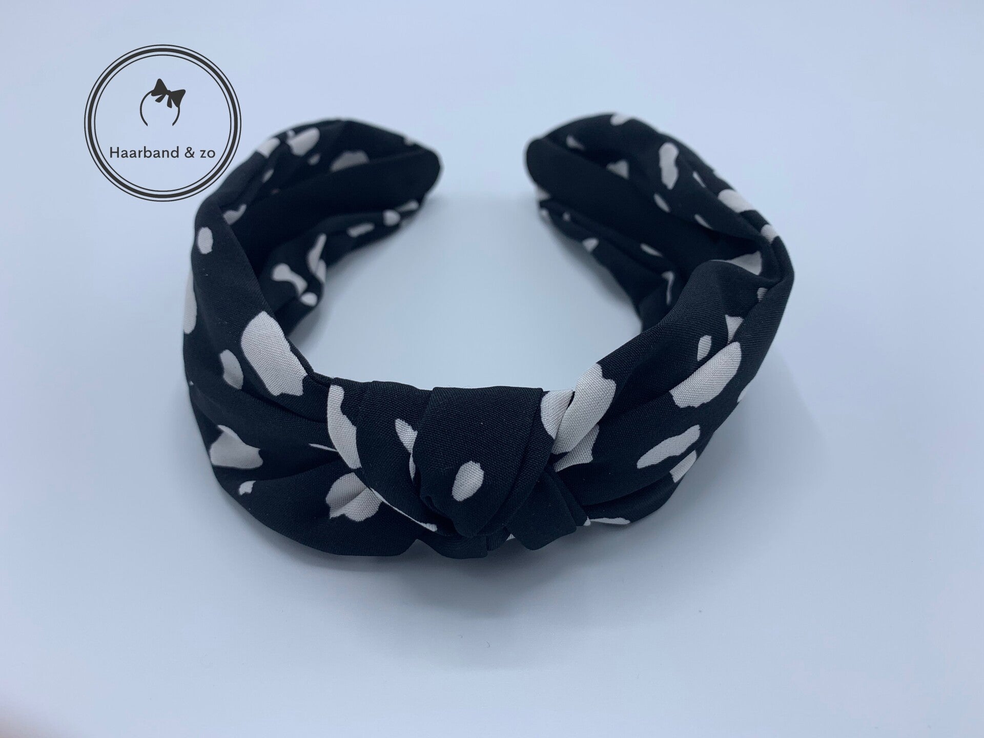 - Booghaarband met knoop in vlekkenprint, zwart met wit. De haarband is los geknoopt, waardoor de stof mooi breed is.