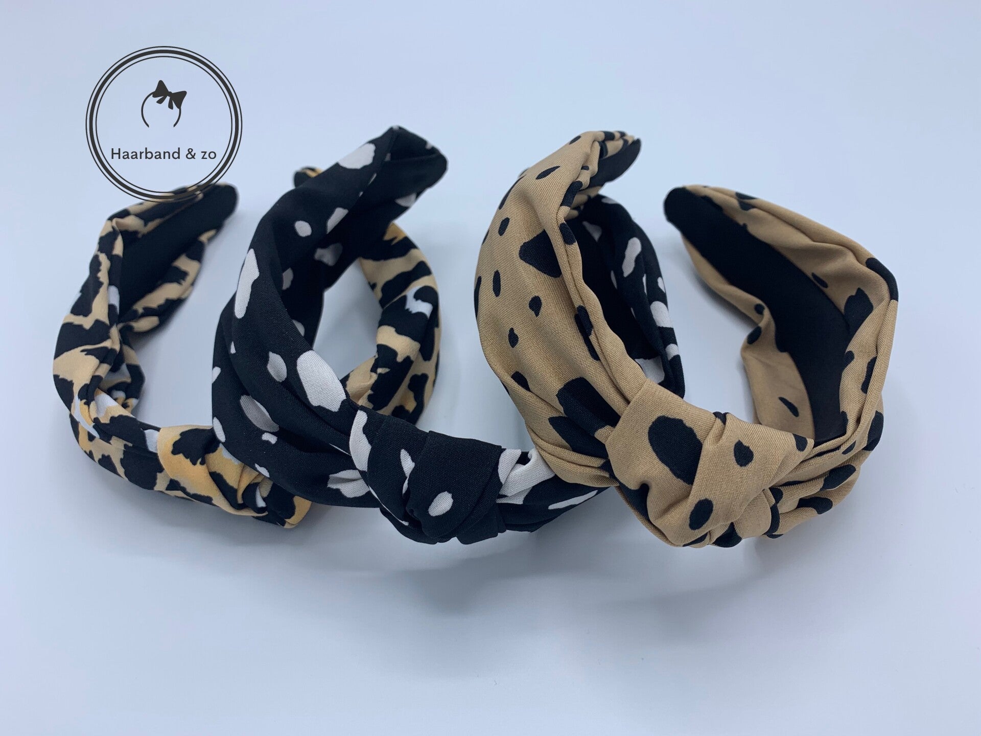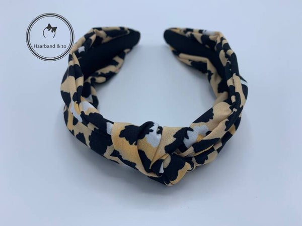 - Booghaarband met knoop in vlekkenprint, zwart met wit. De haarband is los geknoopt, waardoor de stof mooi breed is.