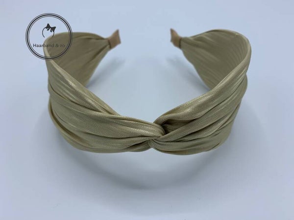 - Prachtige brede booghaarband met twist, uitgevoerd in glanzend satijn met steepje. In de kleur beige.