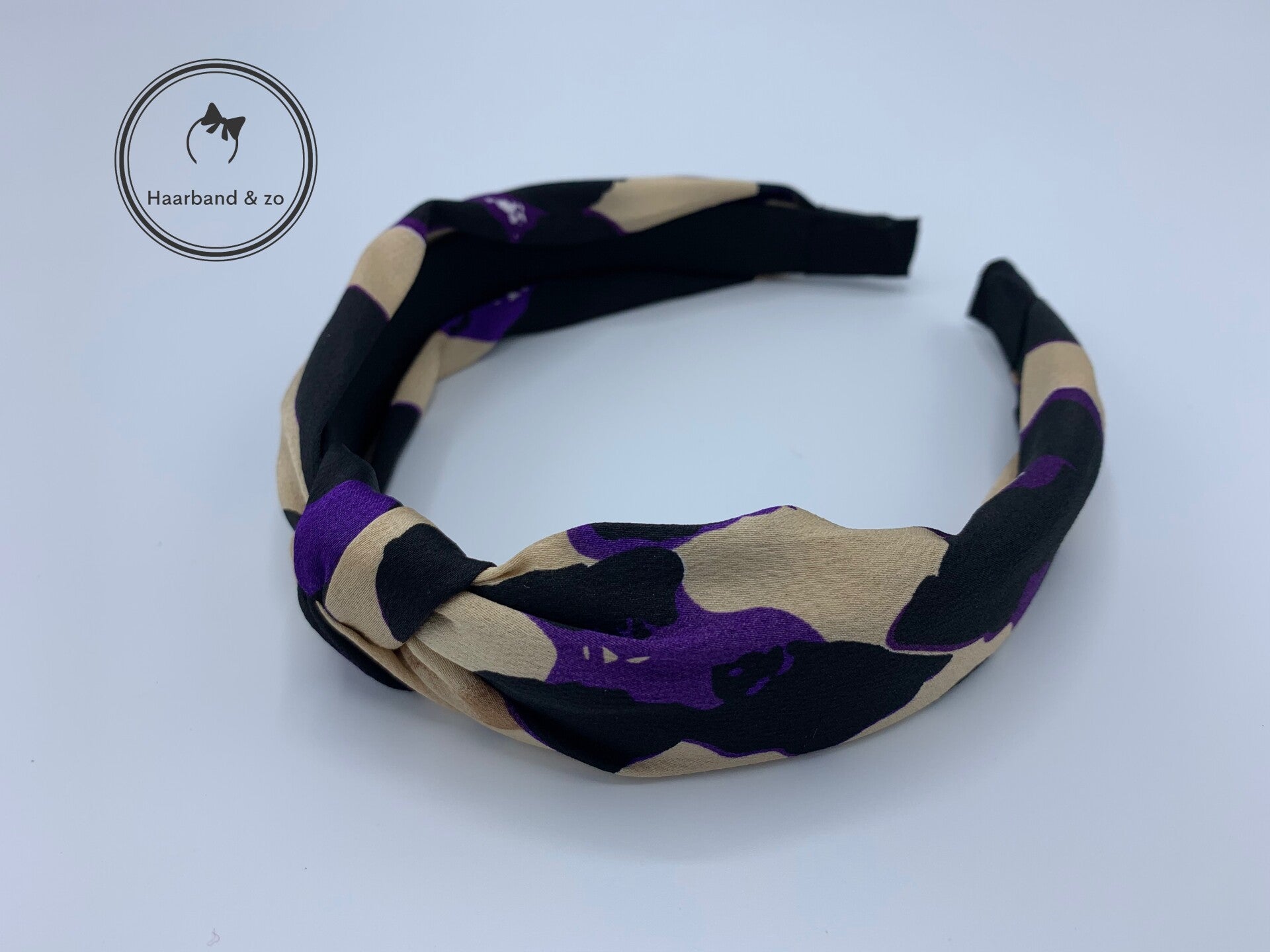 - Mooie Satijnen (boog)haarband met tijgerprint, met paarse accenten.