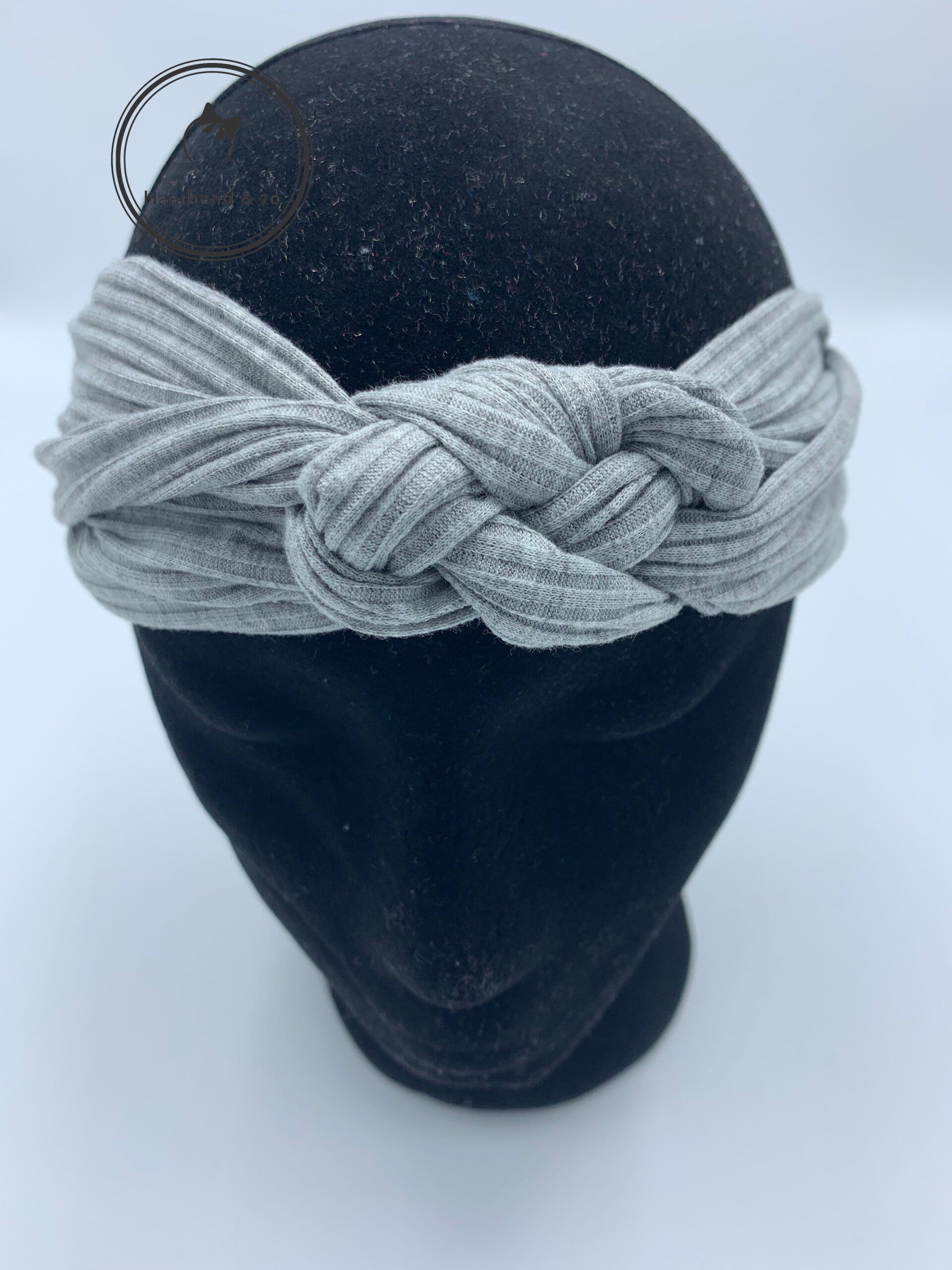 - Fijne elastische haarband van ribbelstof, met twist, in de kleur grijs.