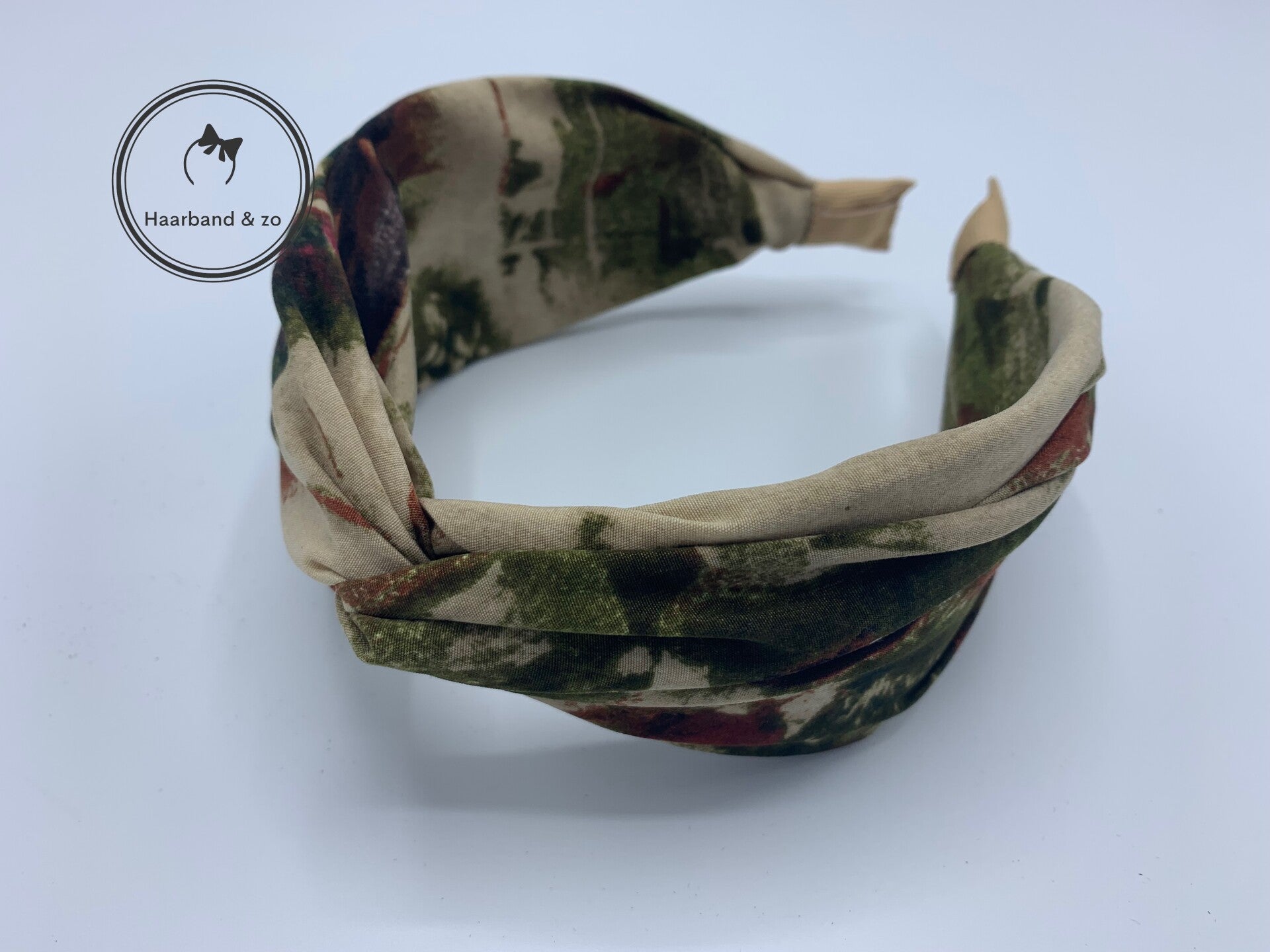Brede booghaarband met twist in meerkleuren print, mosgroen/beige (art.nr. 115-03)