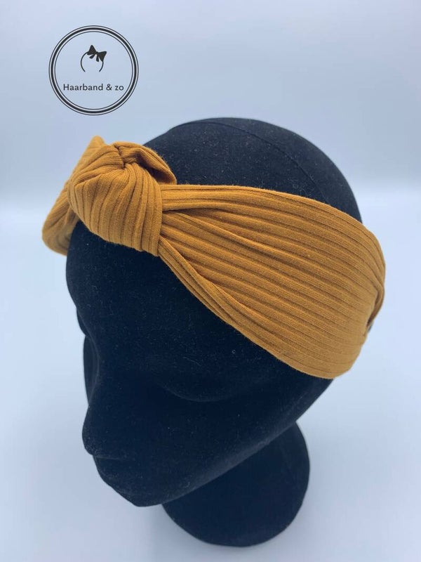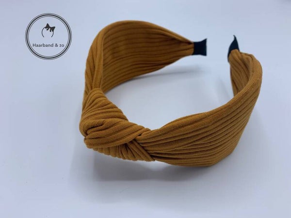 - Brede booghaarband met knoop van zachte ribbelstof in cider kleur.