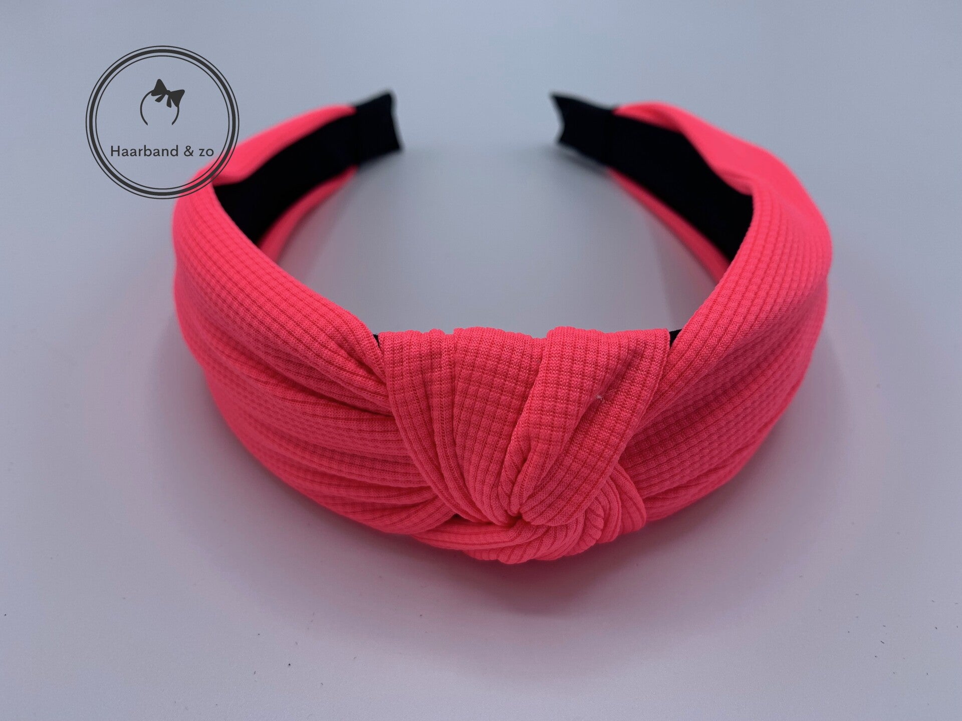 - Brede haarband met knoop van satijn in wafelpatroon, in een knallende kleur, neon-roze.