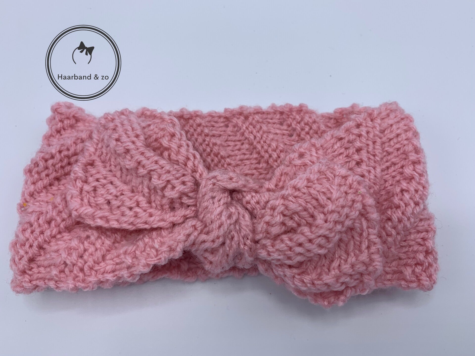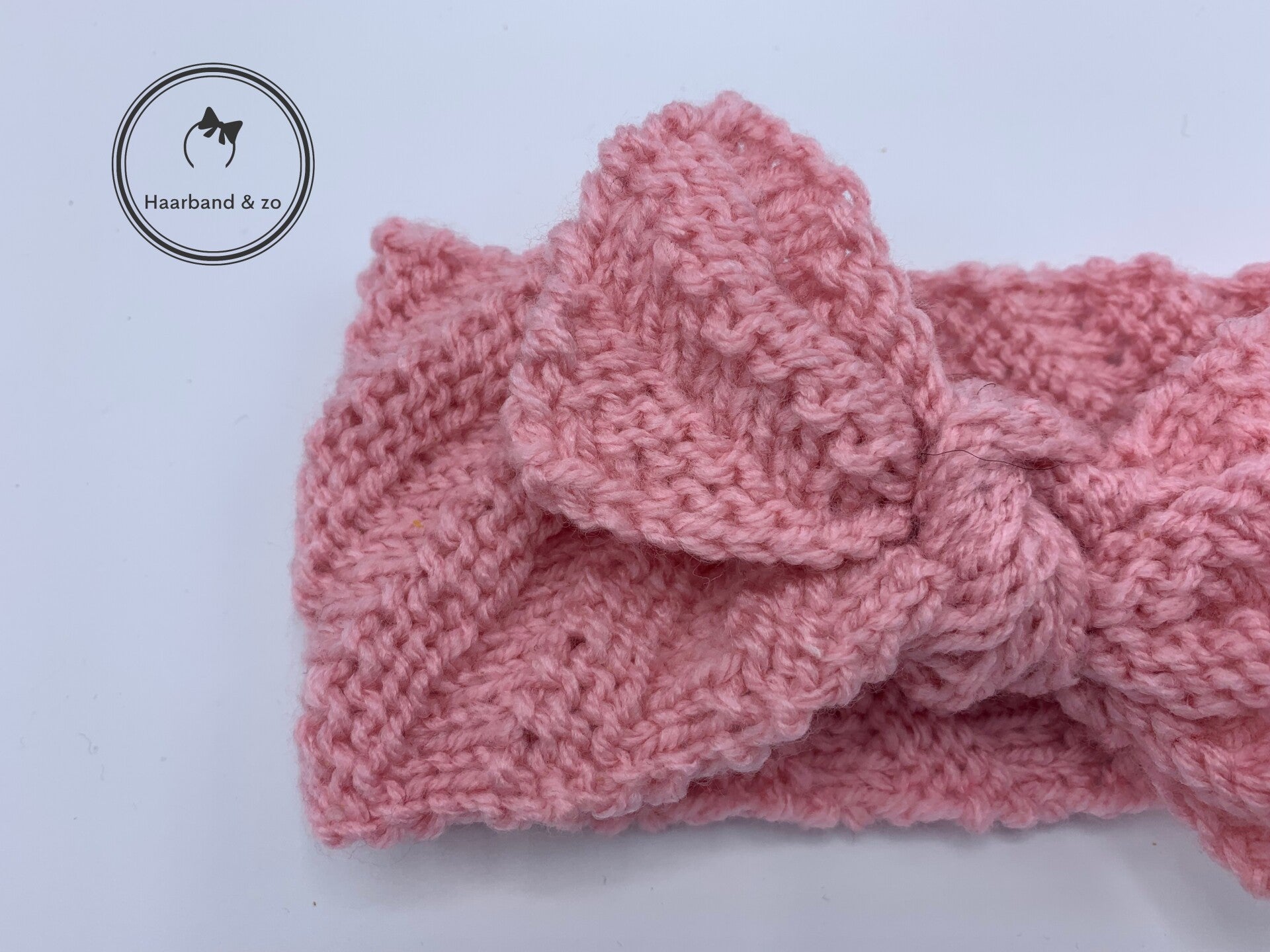 - Gebreid babyhaarbandje in schuin gestreept motief, met strik in roze kleur.