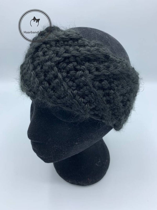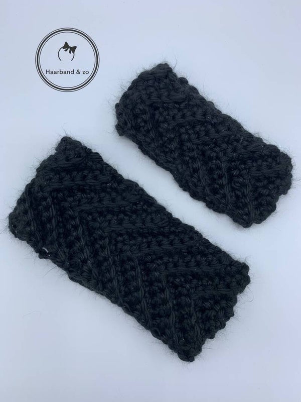 Gebreide babyhaarband in visgraat motief, zwart met glitterdraad. (G01-05)