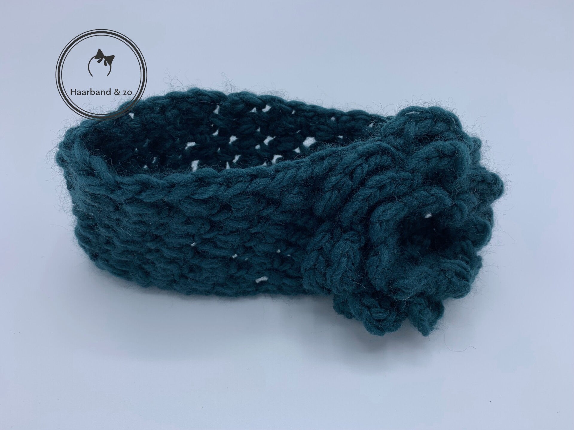 Gebreide babyhoofdband met grote bloem, petrolkleur (art.nr. G02-03)