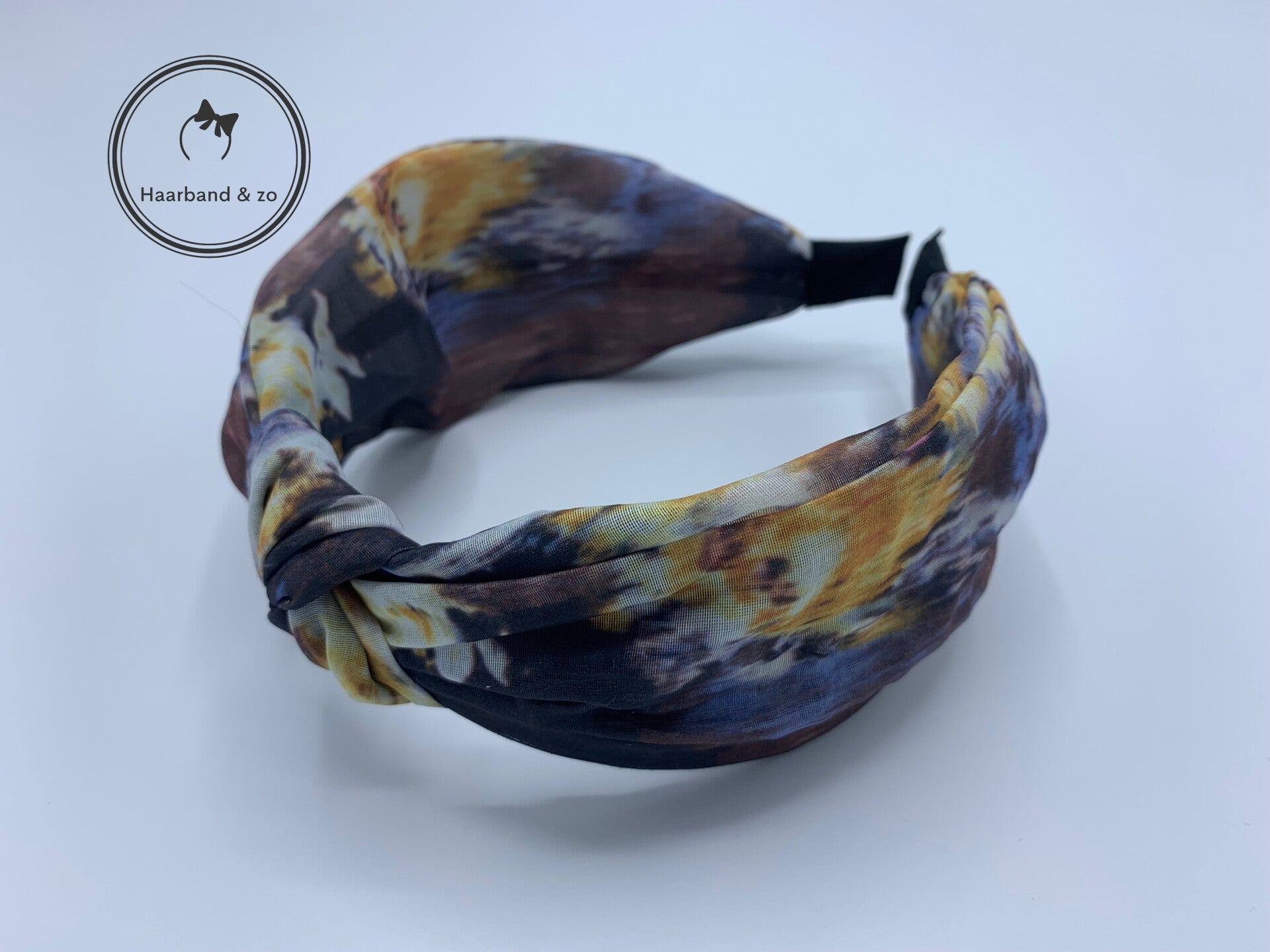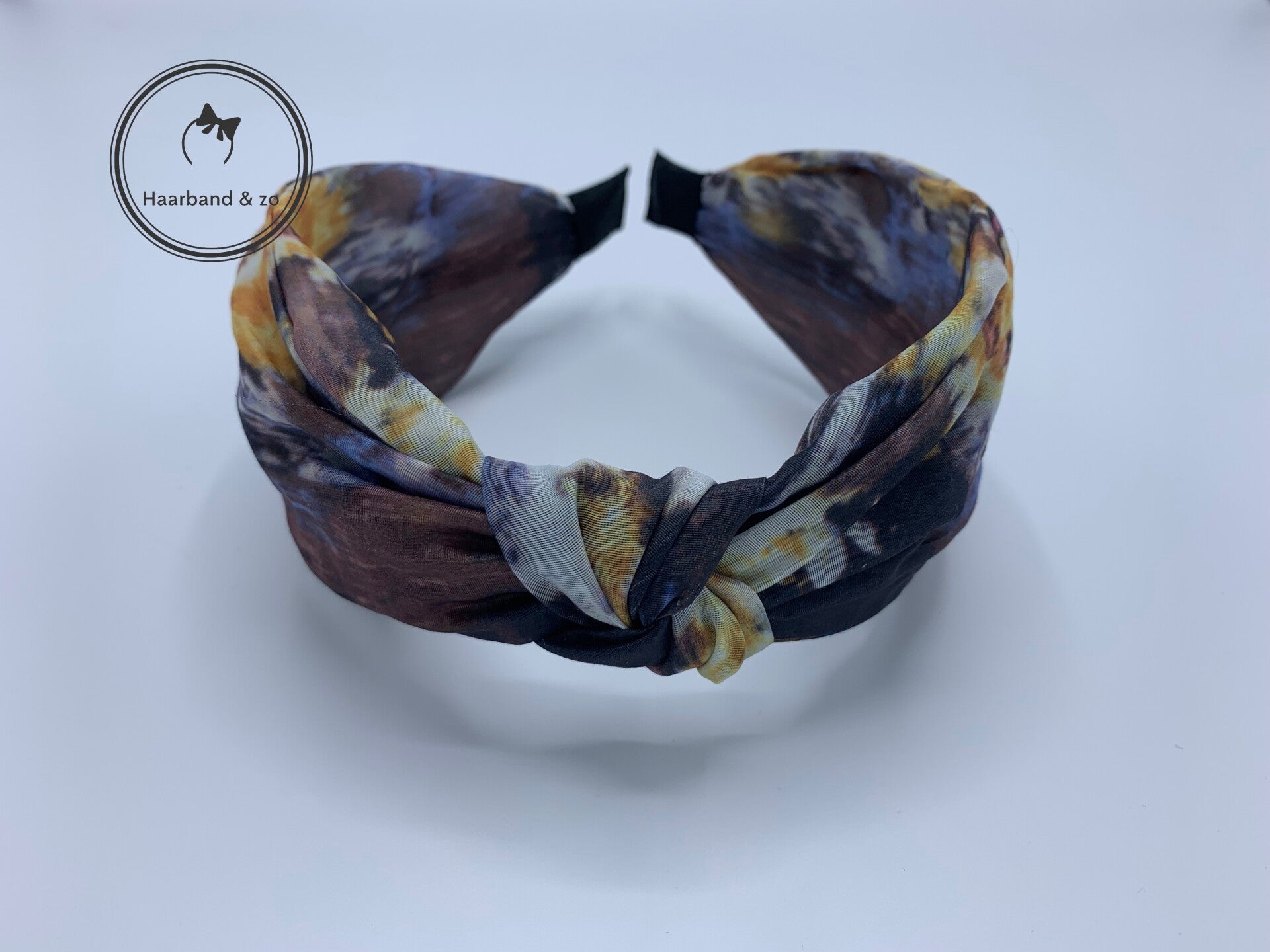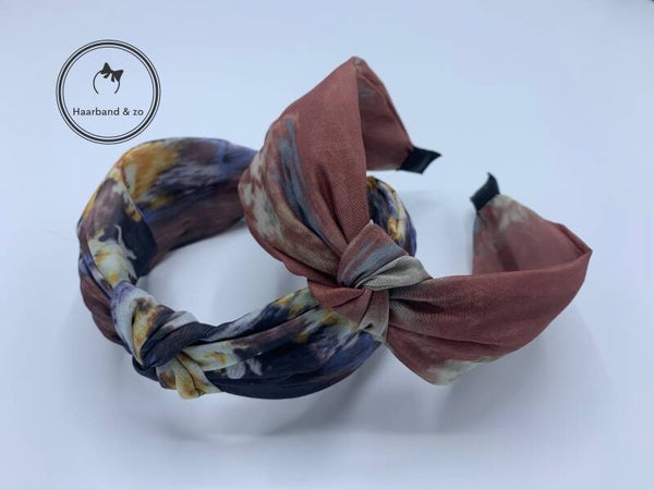 - De haarband is breed zoals een haarband met twist, maar heeft een knoop middenop.