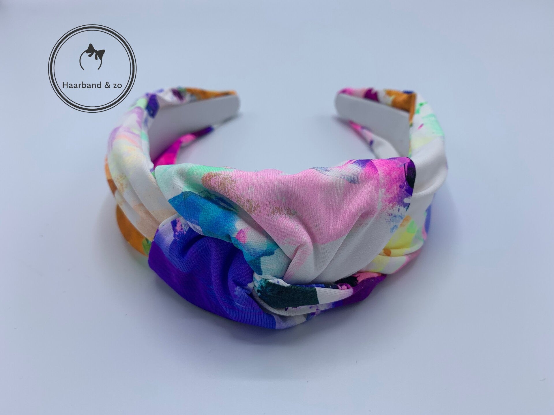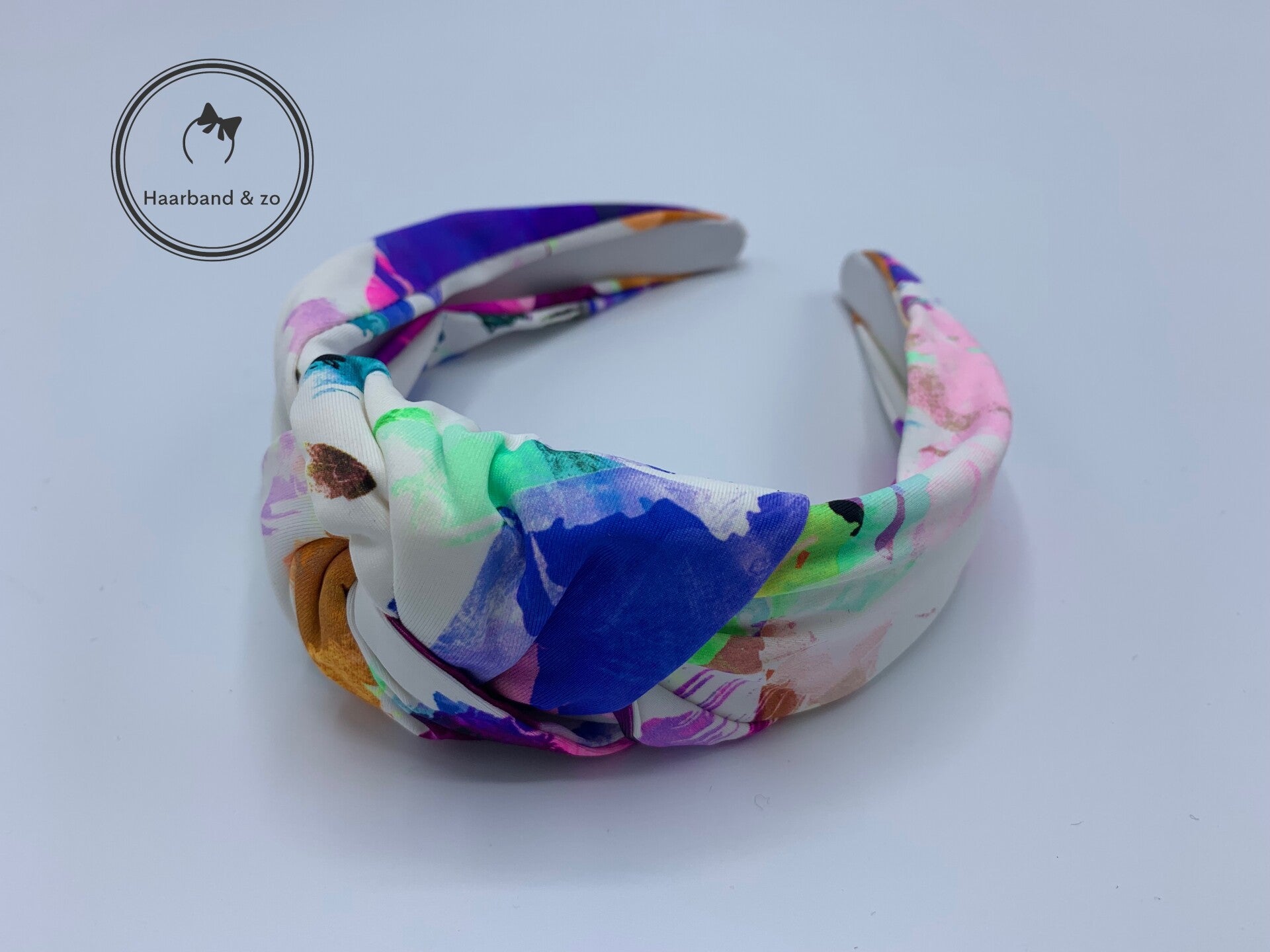 Extra brede booghaarband met knoop in prachtige multicolor print op een witte ondergrond (art. nr 231-04)