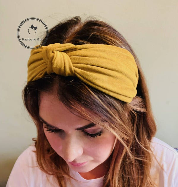 - De haarband is breed zoals een haarband met twist, maar heeft een knoop middenop.