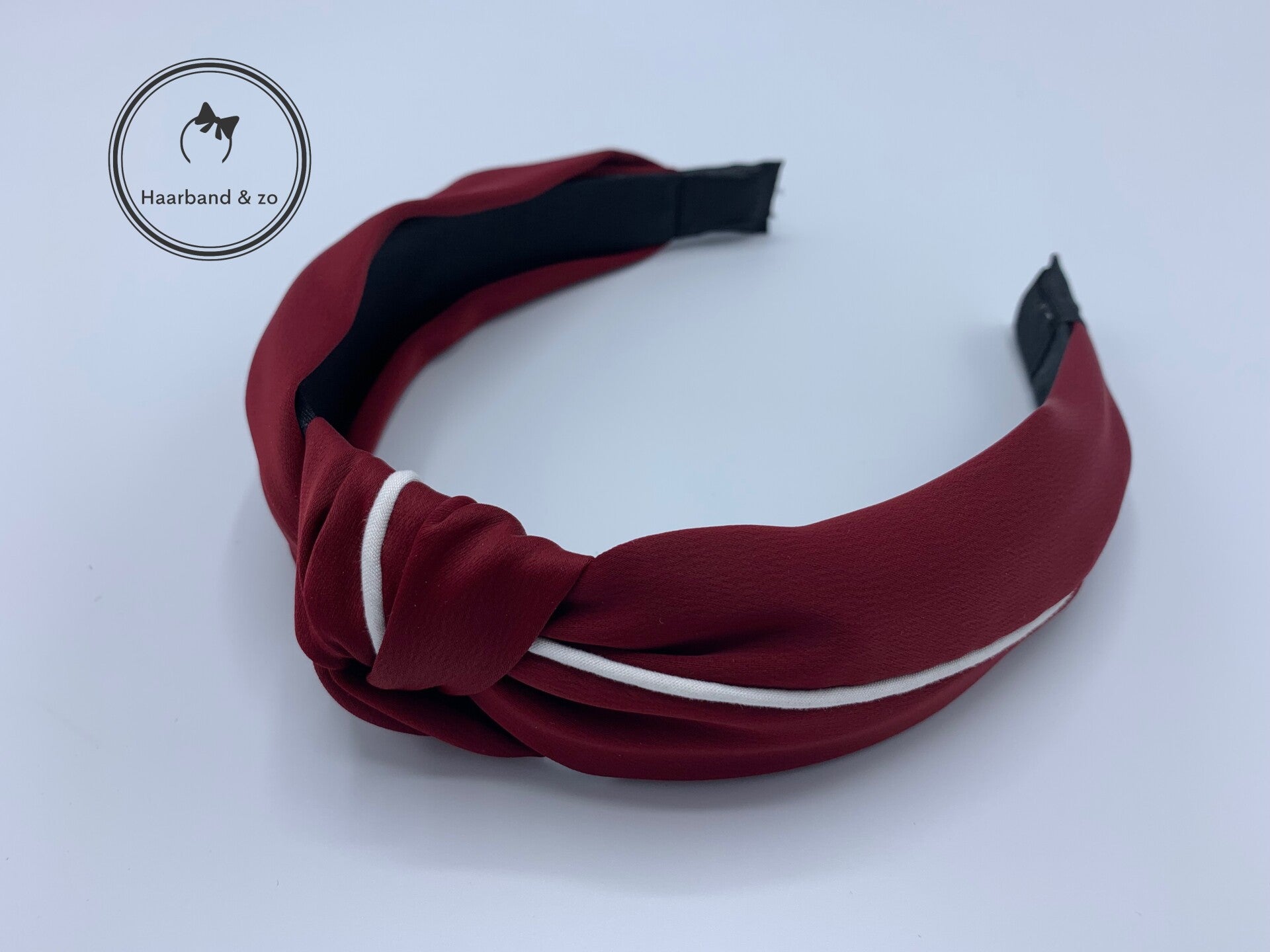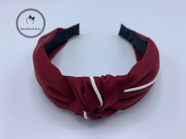 - Satijnen haarband, wijnrood met witte bies.