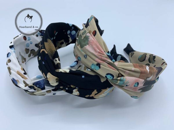 Brede booghaarband met twist in print met zwarte ondergrond (art.nr. 149-02)